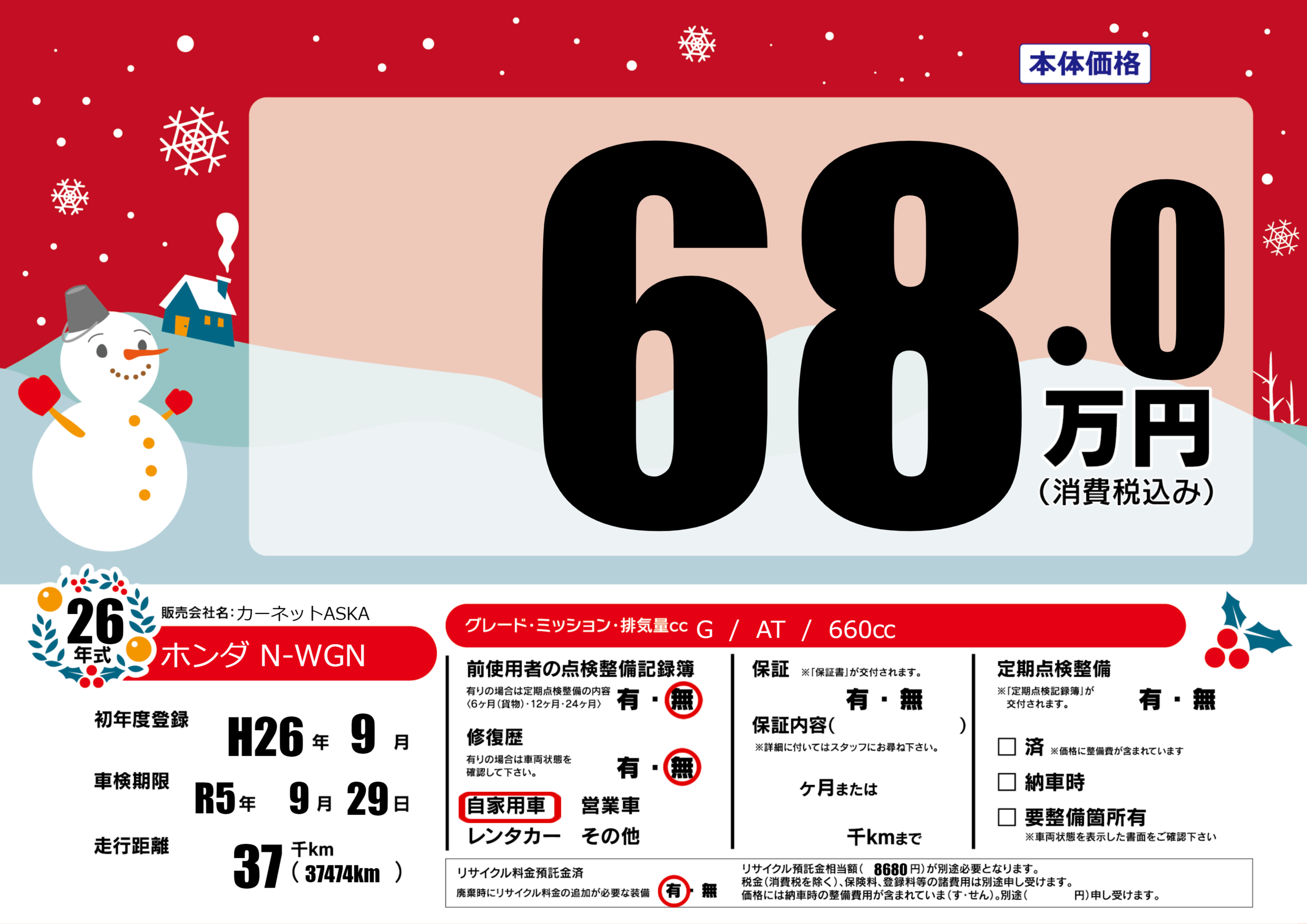 | 車名 | ホンダ N-WGN | グレード ミッション 排気量 |