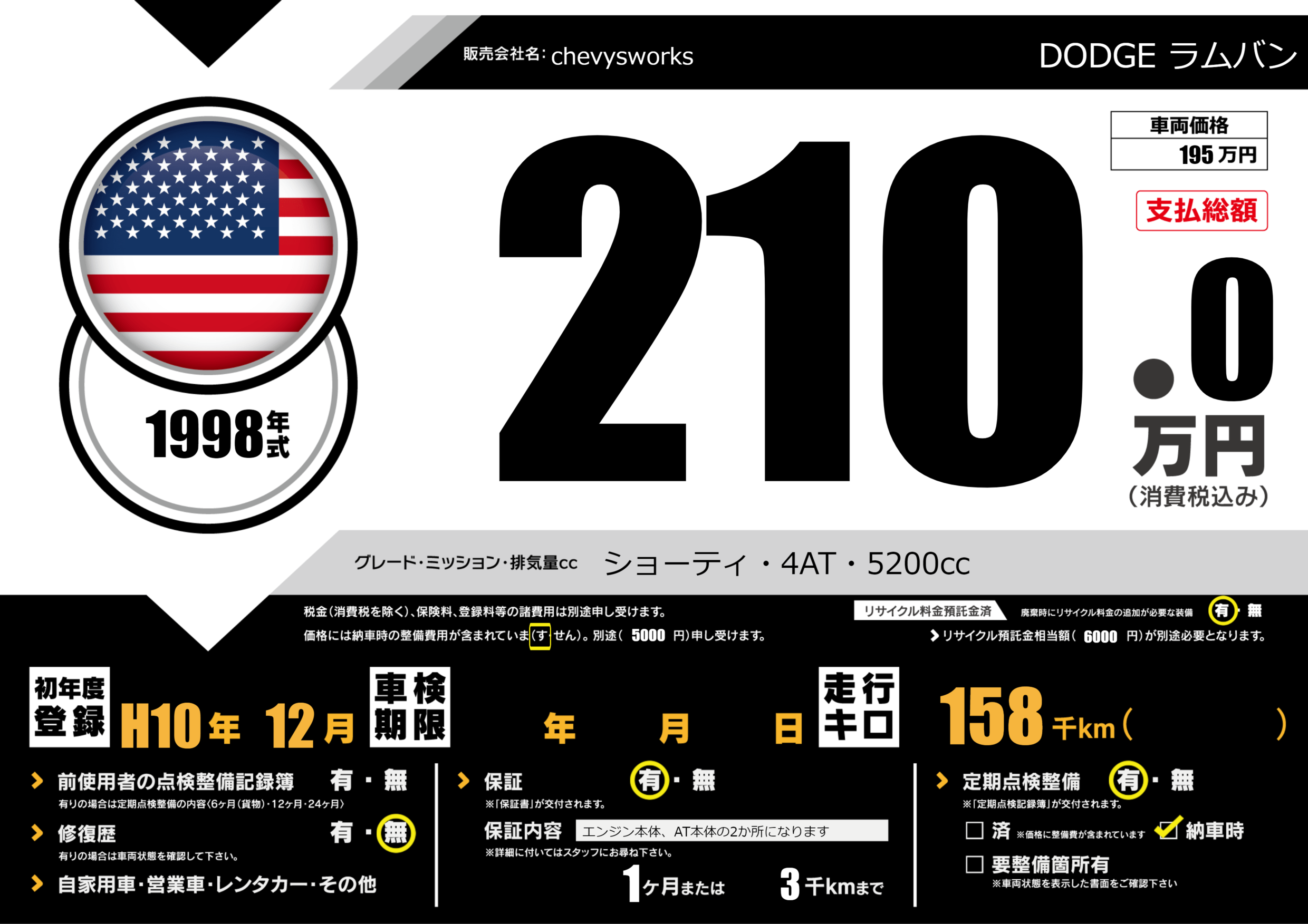 | 車名 | DODGE ラムバン | グレード ミッション 排気量 |