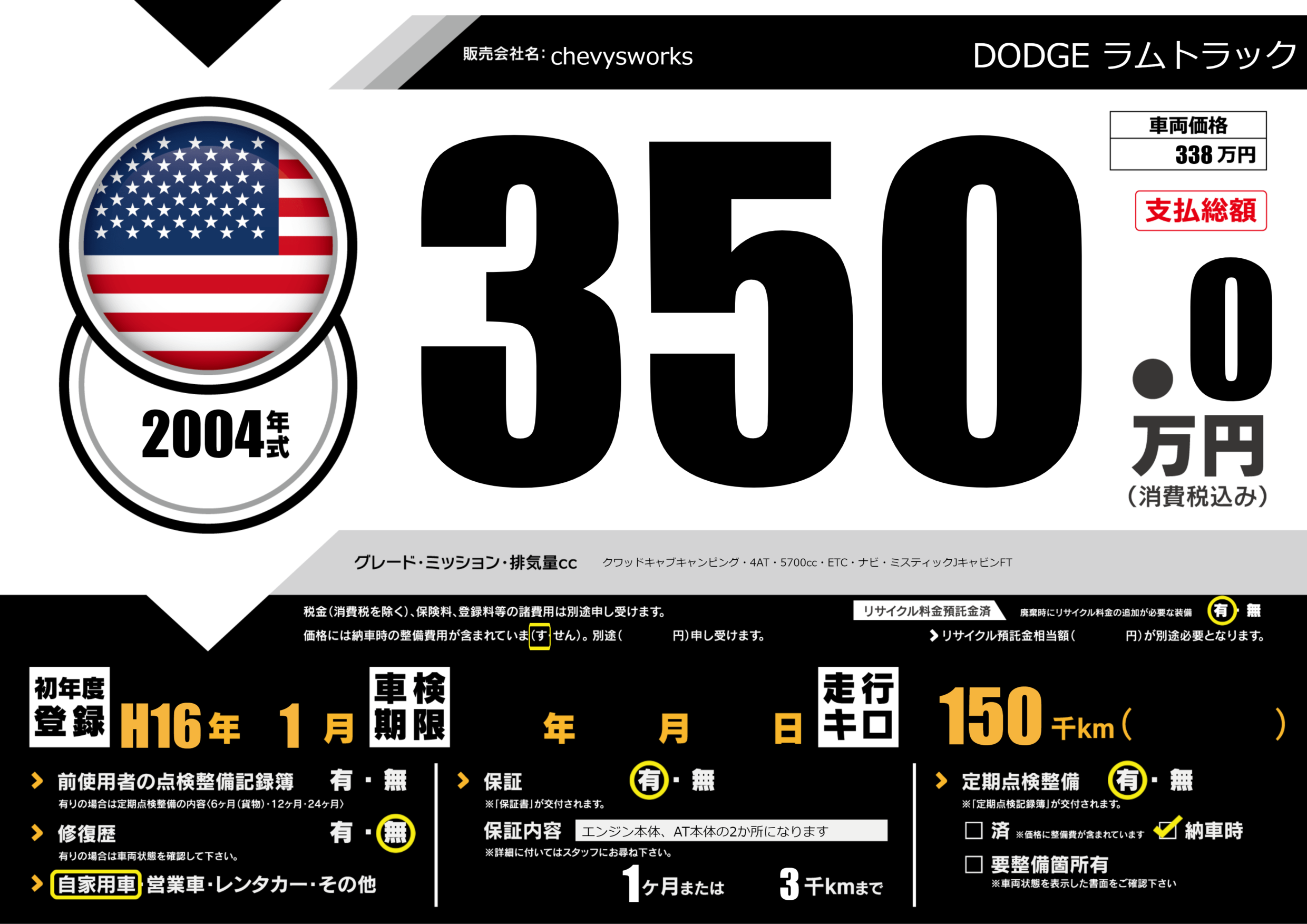 | 車名 | DODGE ラムトラック | グレード ミッション 排気量 |