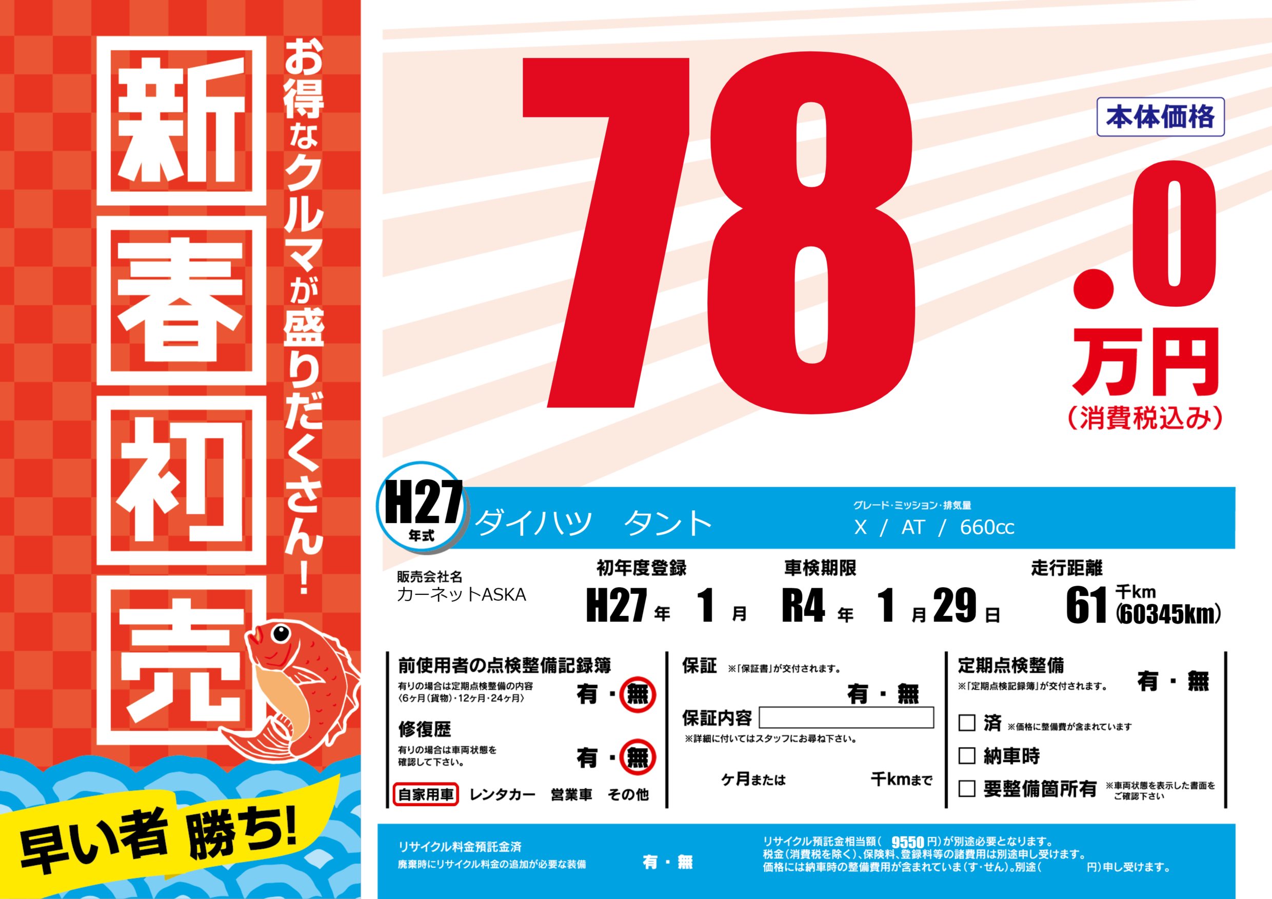 | 車名 | ダイハツ タント | グレード ミッション 排気量 |