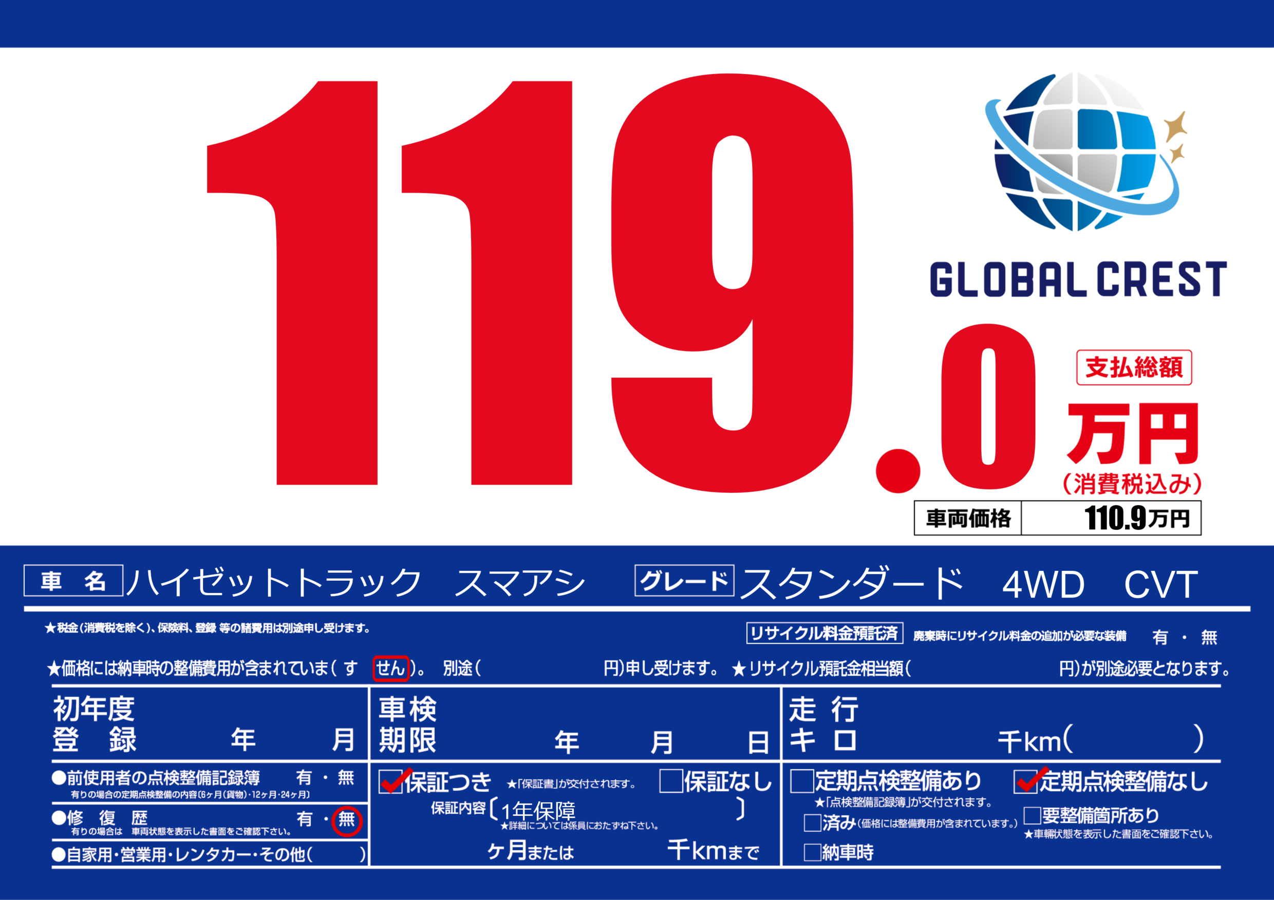 | 車名 | ハイゼットトラック スマアシ | グレード ミッション 排気量 |
