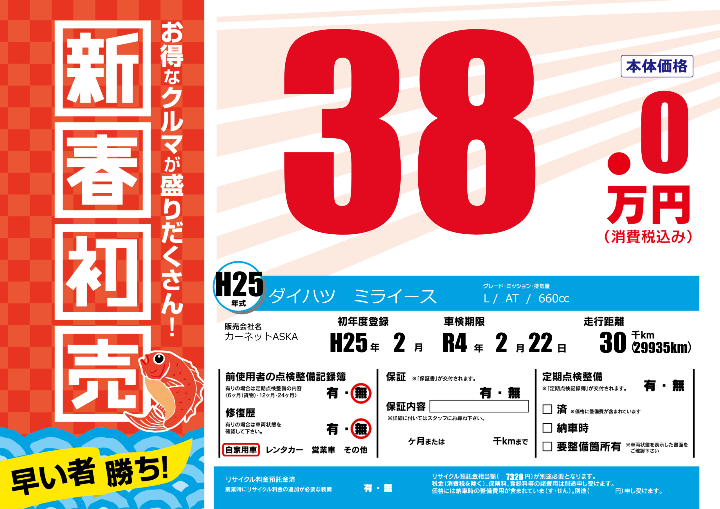 | 走行キロ | 3万km | 初年度登録 | H25年2月 |