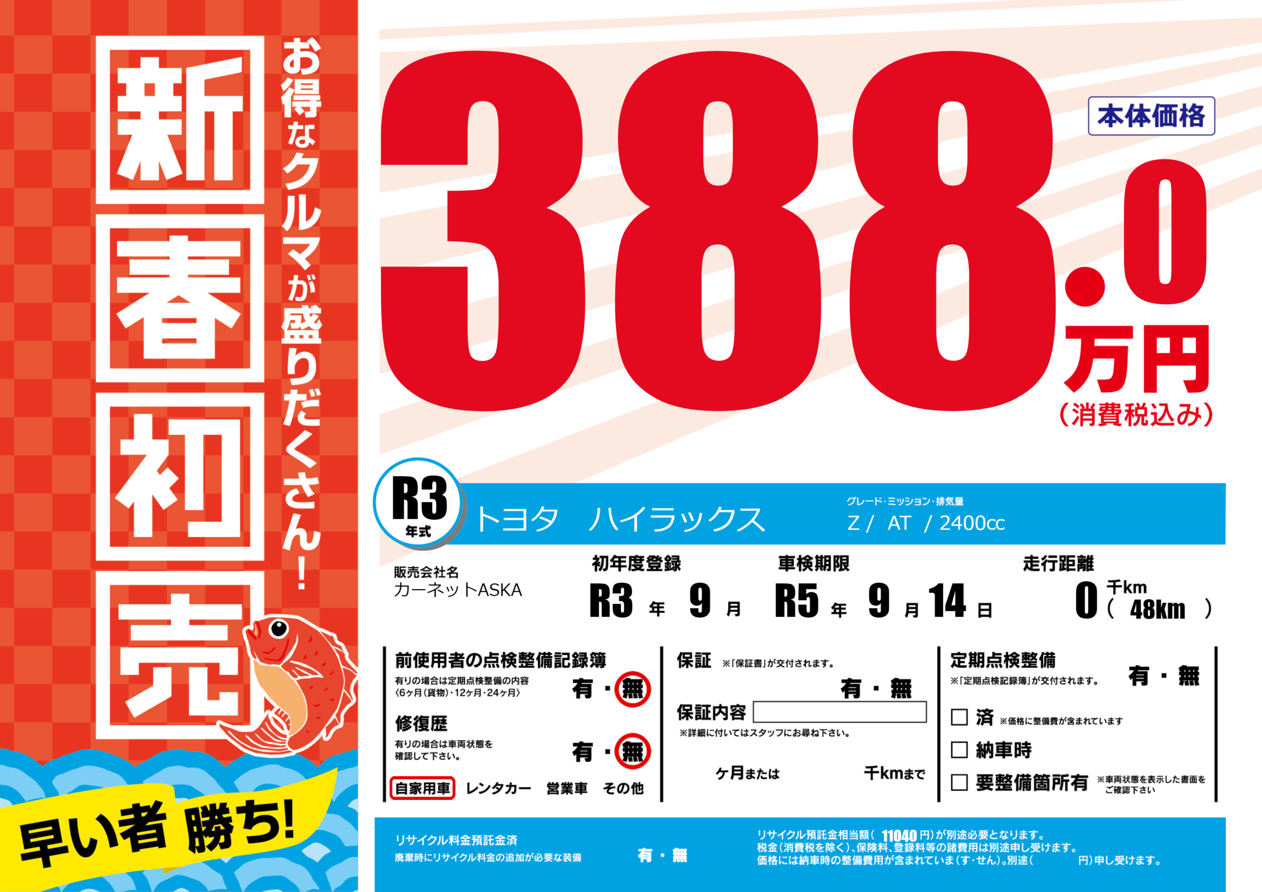| 車名 | トヨタ ハイラックス | グレード ミッション 排気量 |