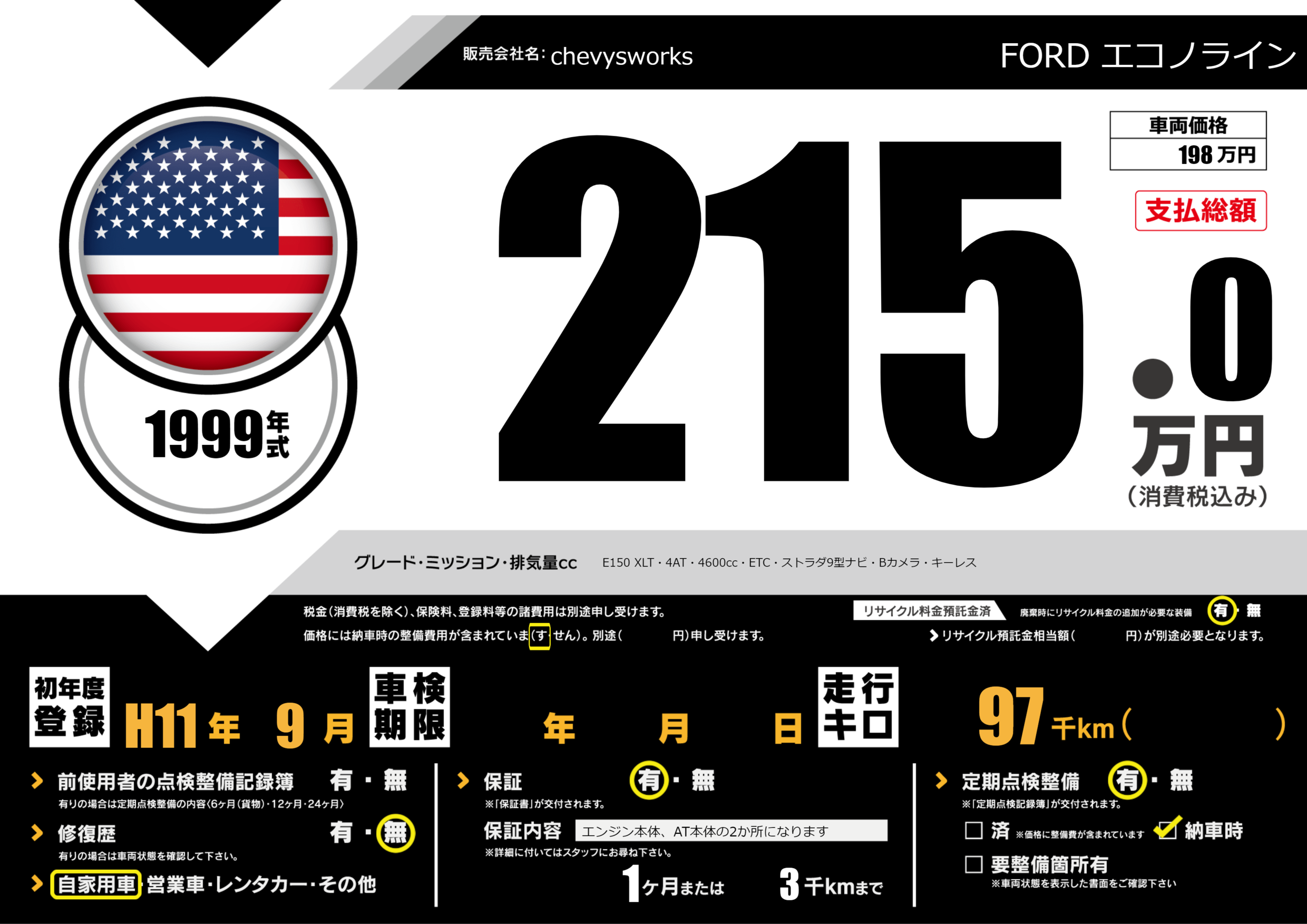 | 車名 | FORD エコノライン | グレード ミッション 排気量 |