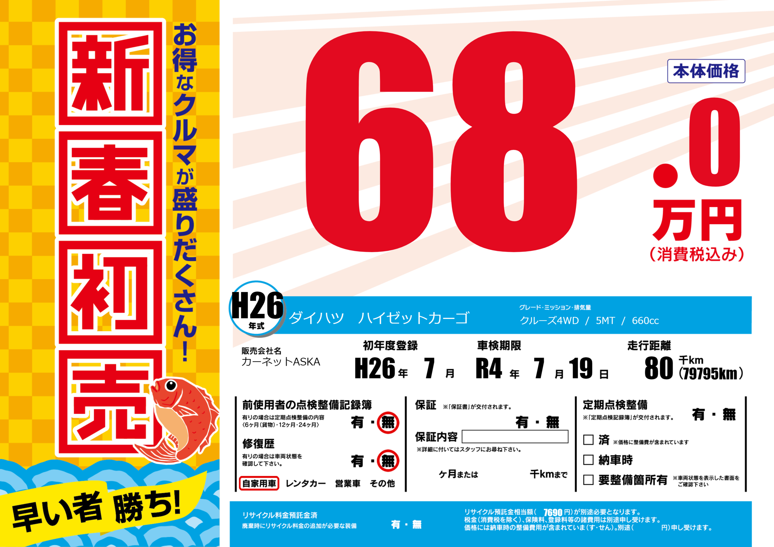 | 車名 | ダイハツ ハイゼットカーゴ | グレード ミッション 排気量 |