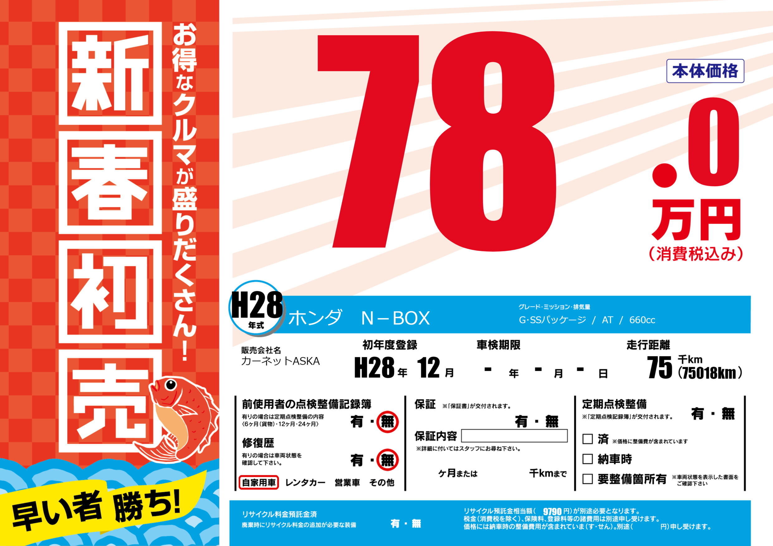 | 走行キロ | 7.5万km | 初年度登録 | H28年12月 |