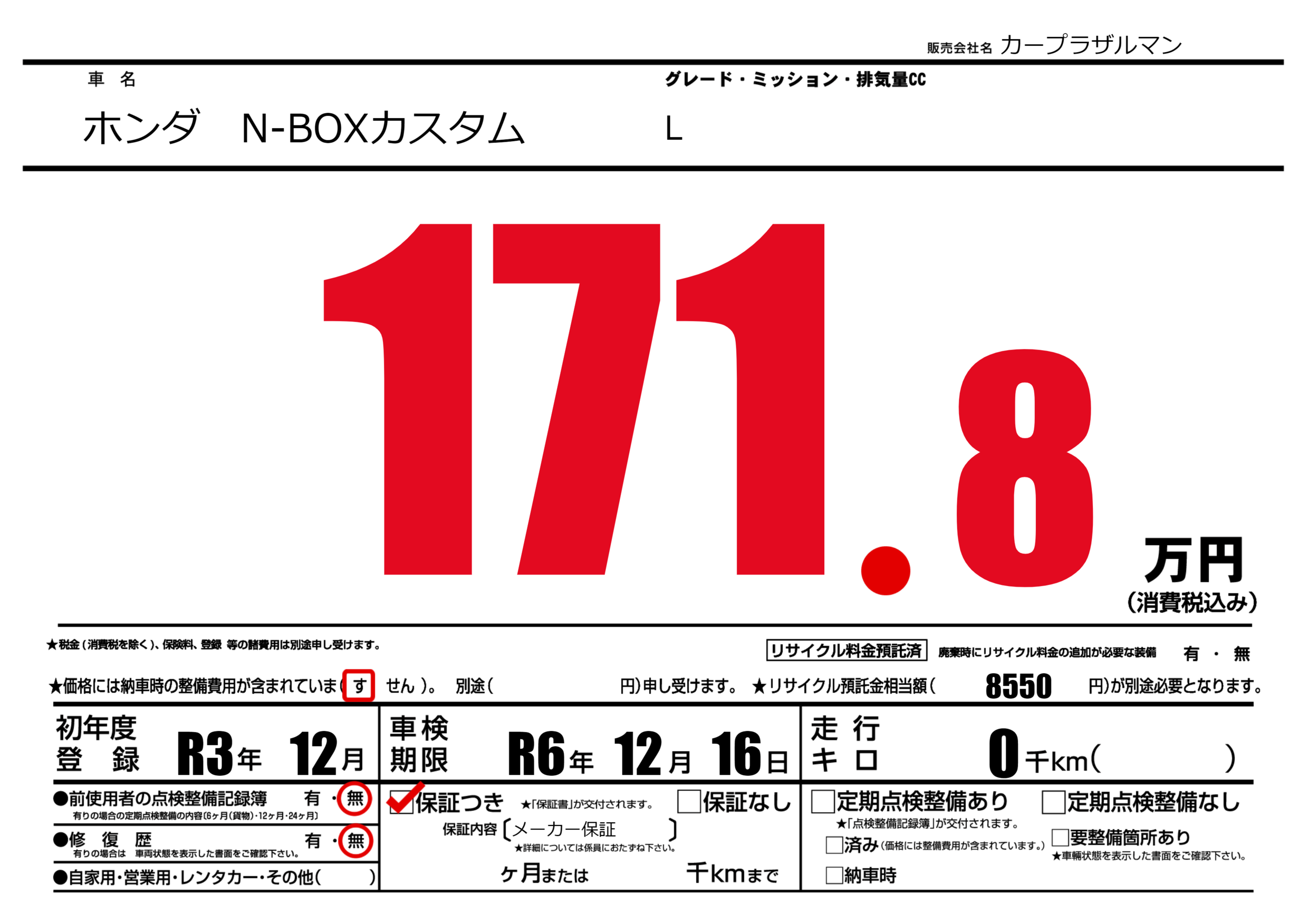 | 車名 | ホンダ N-BOXカスタム | グレード ミッション 排気量 |