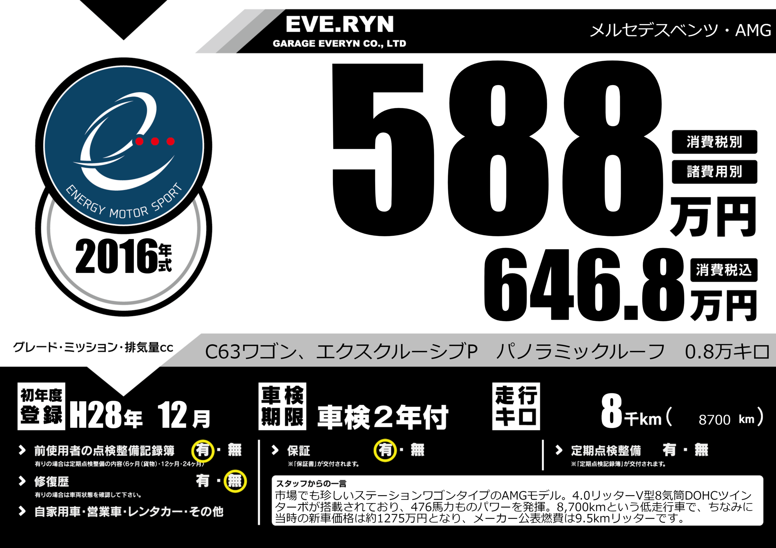 C63ワゴン、エクスクルーシブP パノラミックルーフ 0.8万キロ |