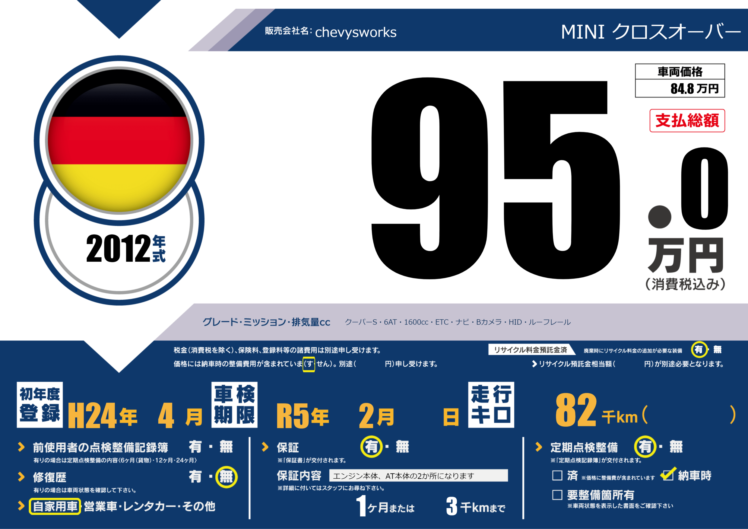 | 車名 | MINI クロスオーバー | グレード ミッション 排気量 |