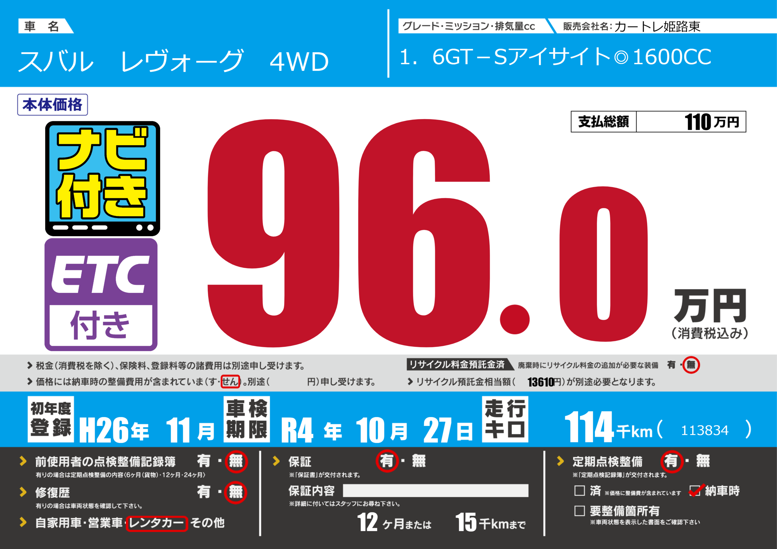 なし | 車検制限 | R4年10月27月 |