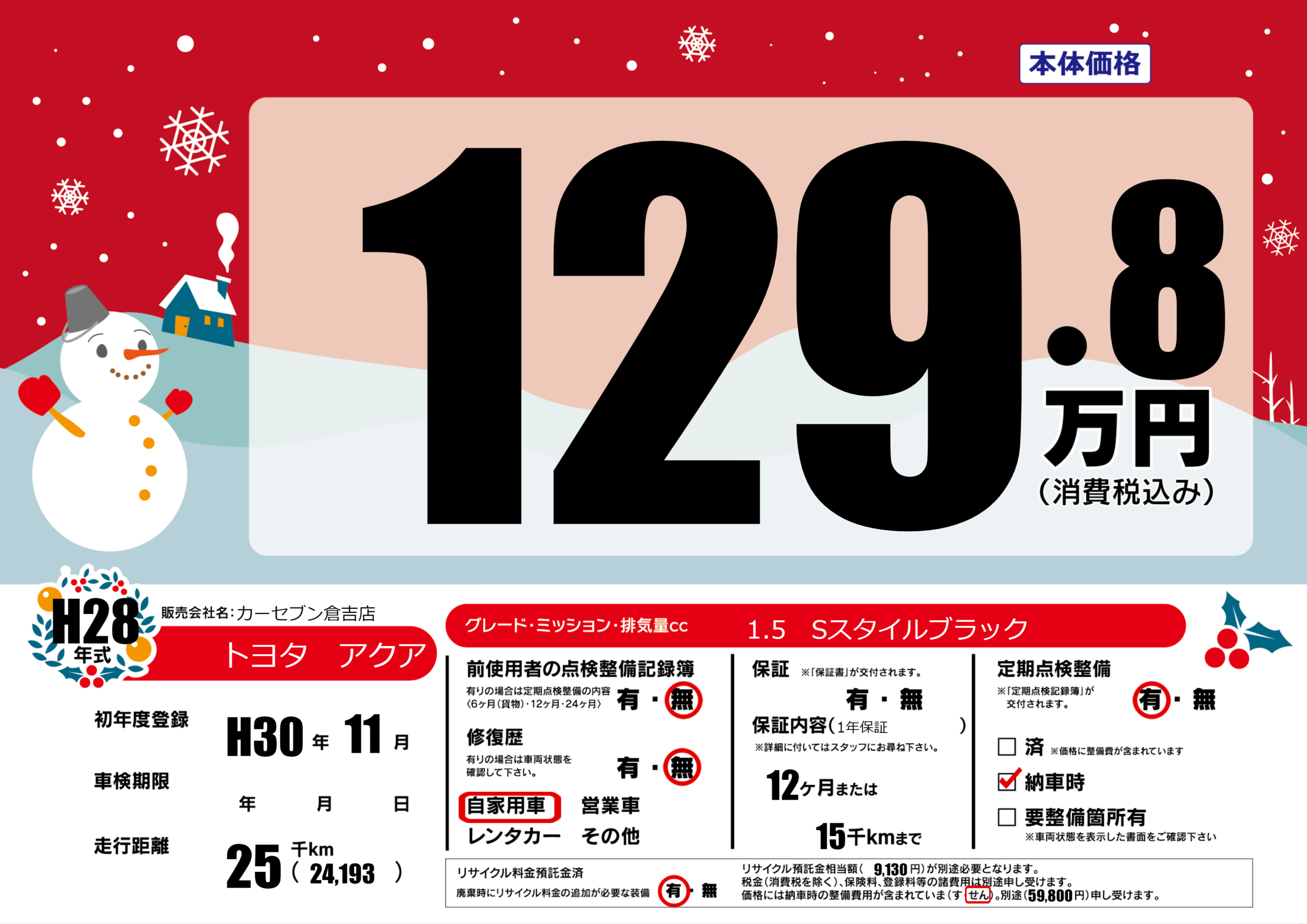 | 車名 | トヨタ アクア | グレード ミッション 排気量 |