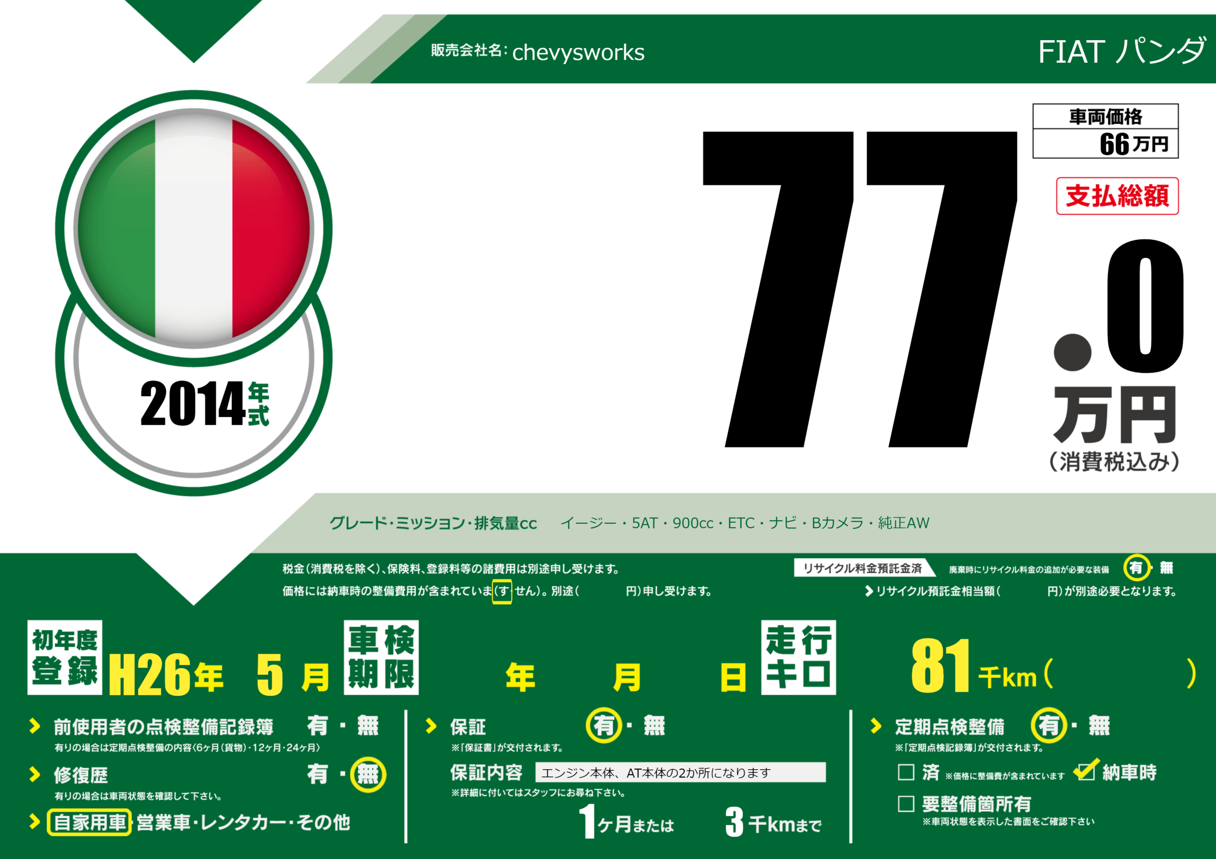 | 車名 | FIAT パンダ | グレード ミッション 排気量 |