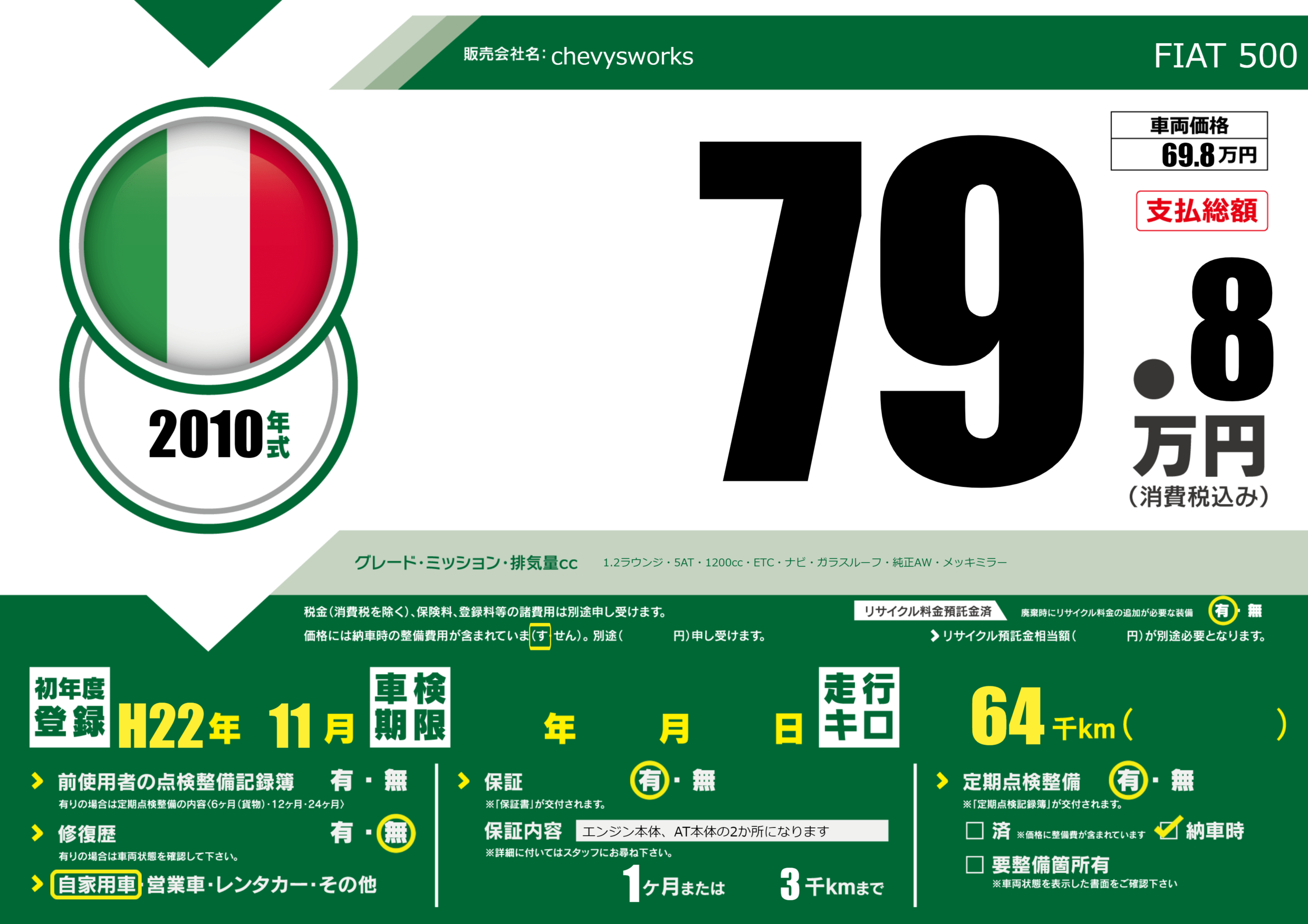 | 車名 | FIAT 500 | グレード ミッション 排気量 |