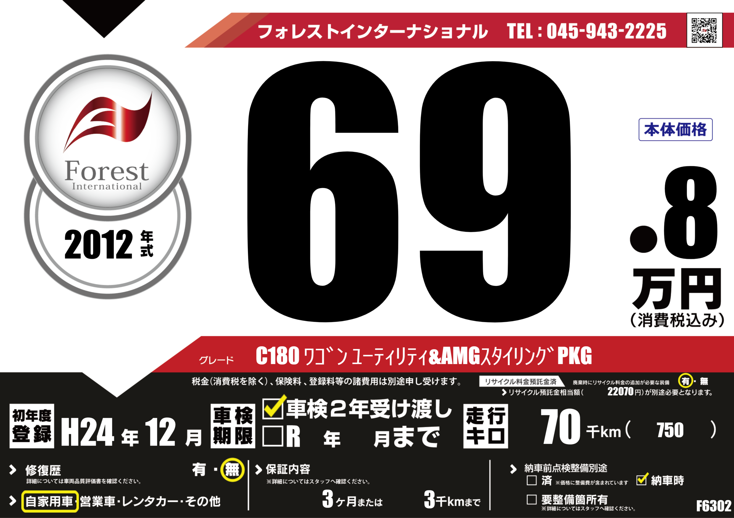 | 走行キロ | 7万km | 初年度登録 | H24年12月 |