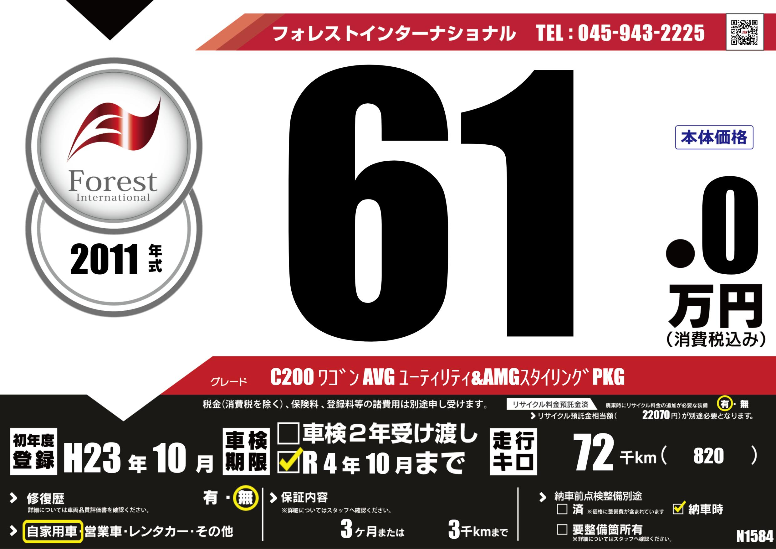 | 走行キロ | 7.2万km | 初年度登録 | H23年10月 |