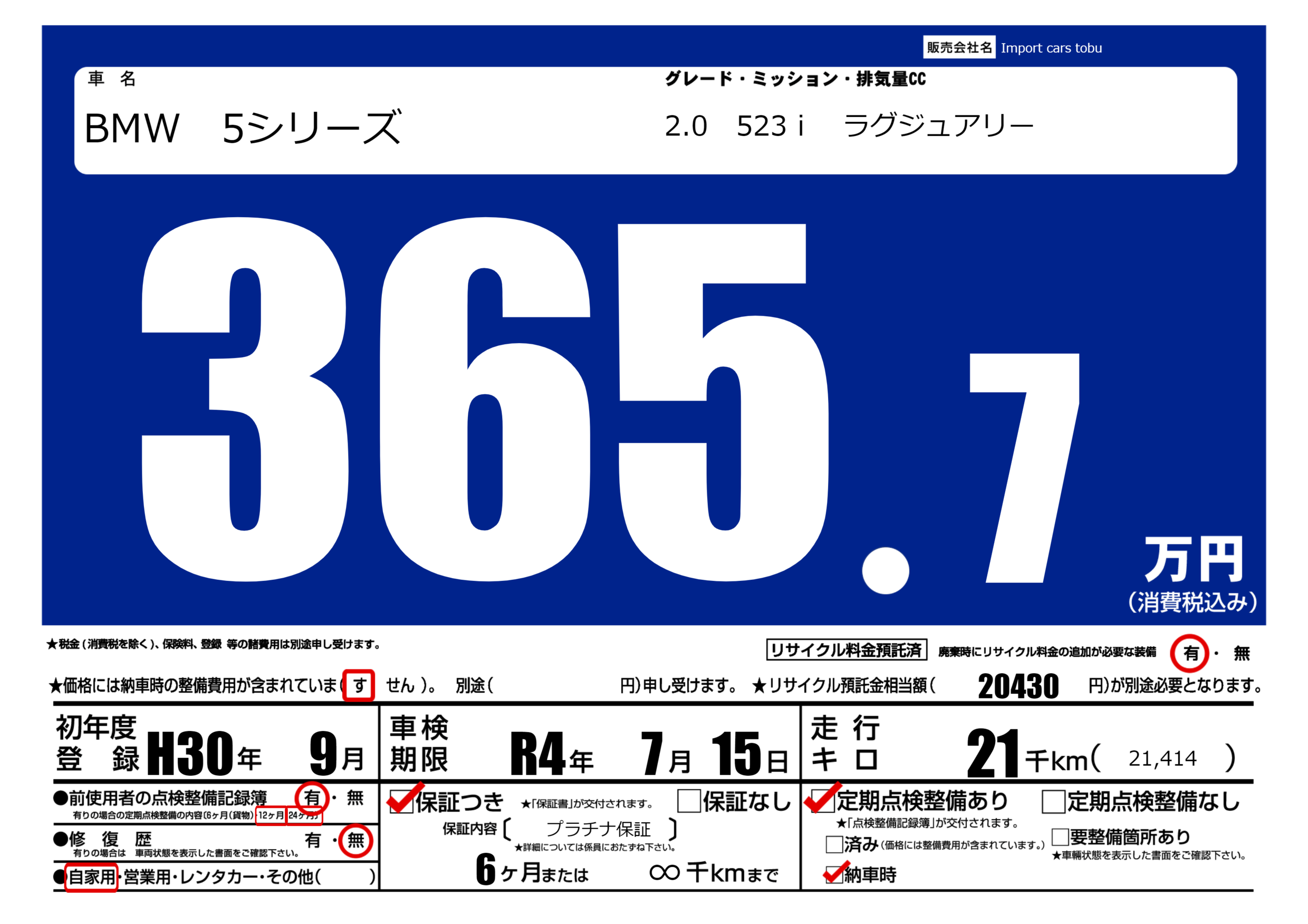 保証付き 保証内容( プラチナ保証) 6ヶ月または(∞)千kmまで |
