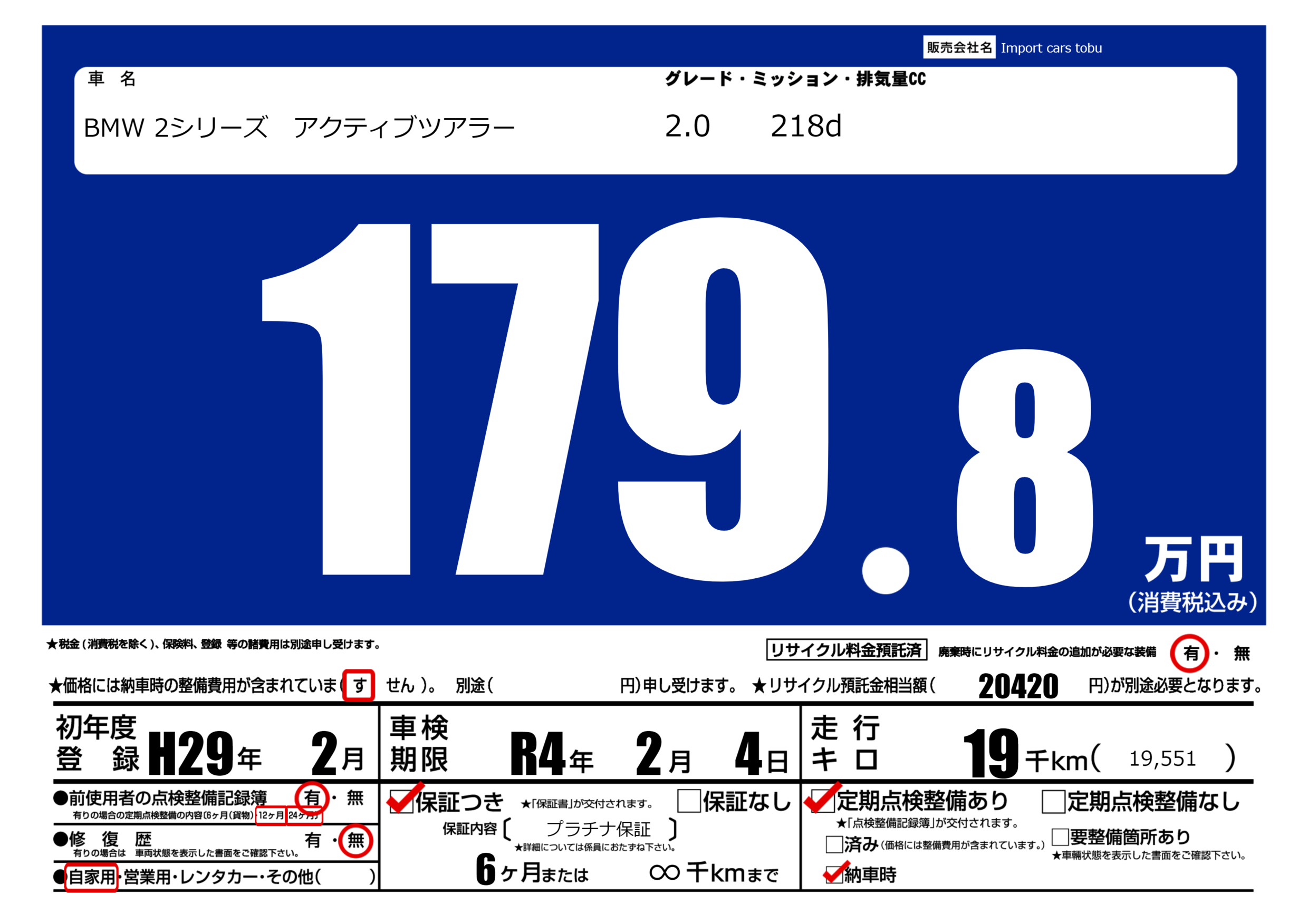保証付き 保証内容( プラチナ保証) 6ヶ月または(∞)千kmまで |