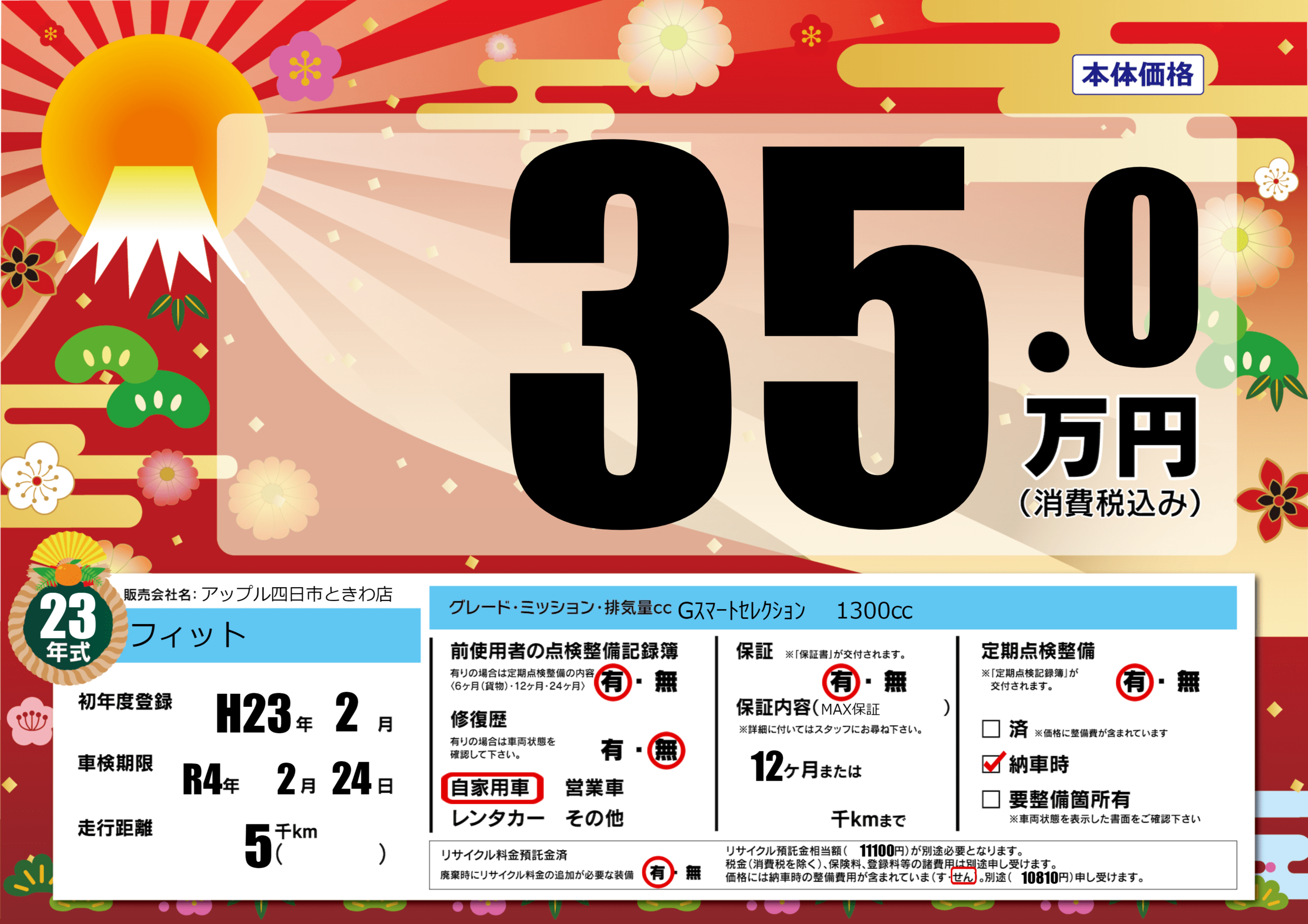 | 走行キロ | 0.5万km | 初年度登録 | H23年2月 |
