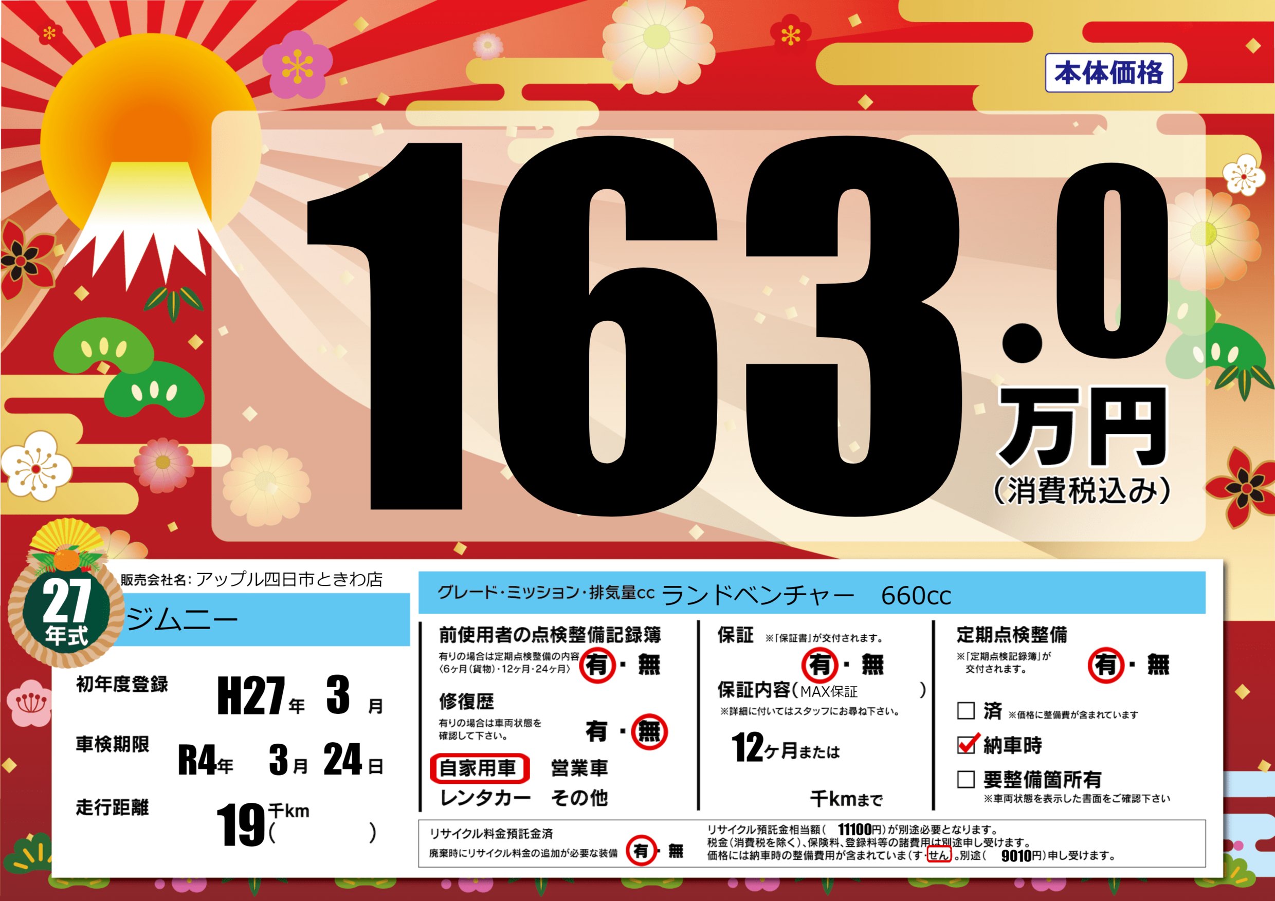 | 車名 | ジムニー | グレード ミッション 排気量 |