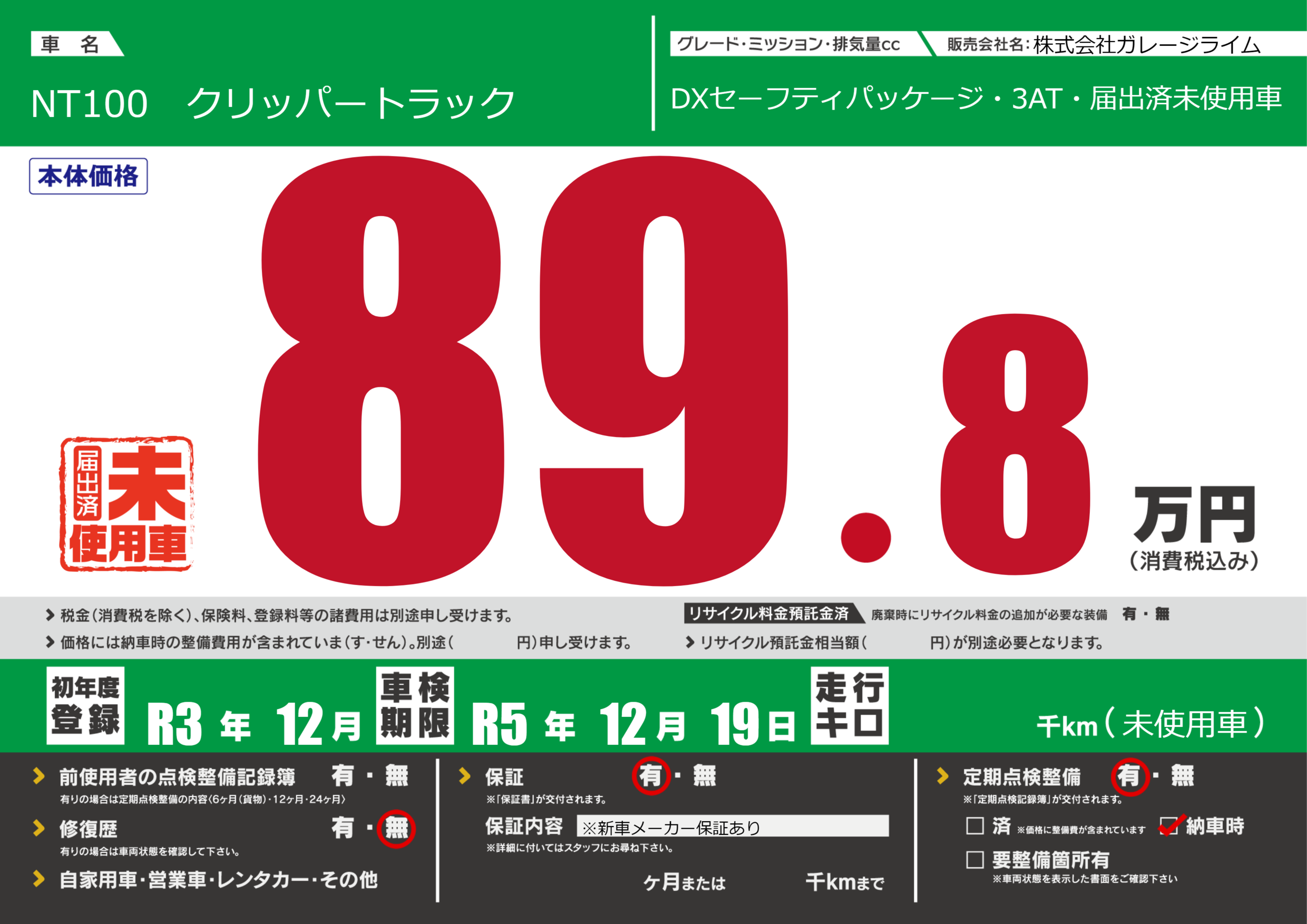 | 定期点検整備 | 定期点検整備あり 納車時あり | ||