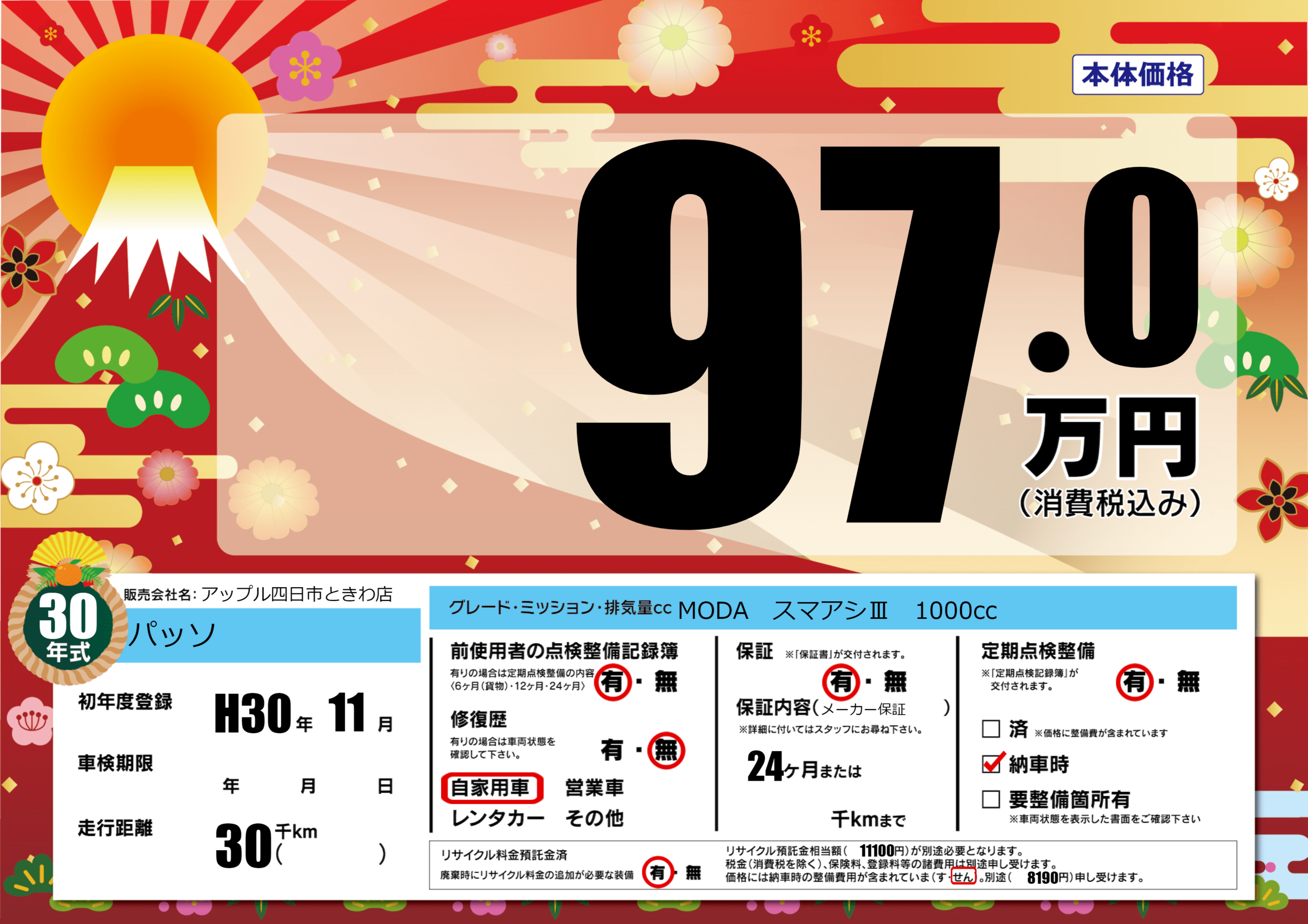 | 走行キロ | 3万km | 初年度登録 | H30年11月 |