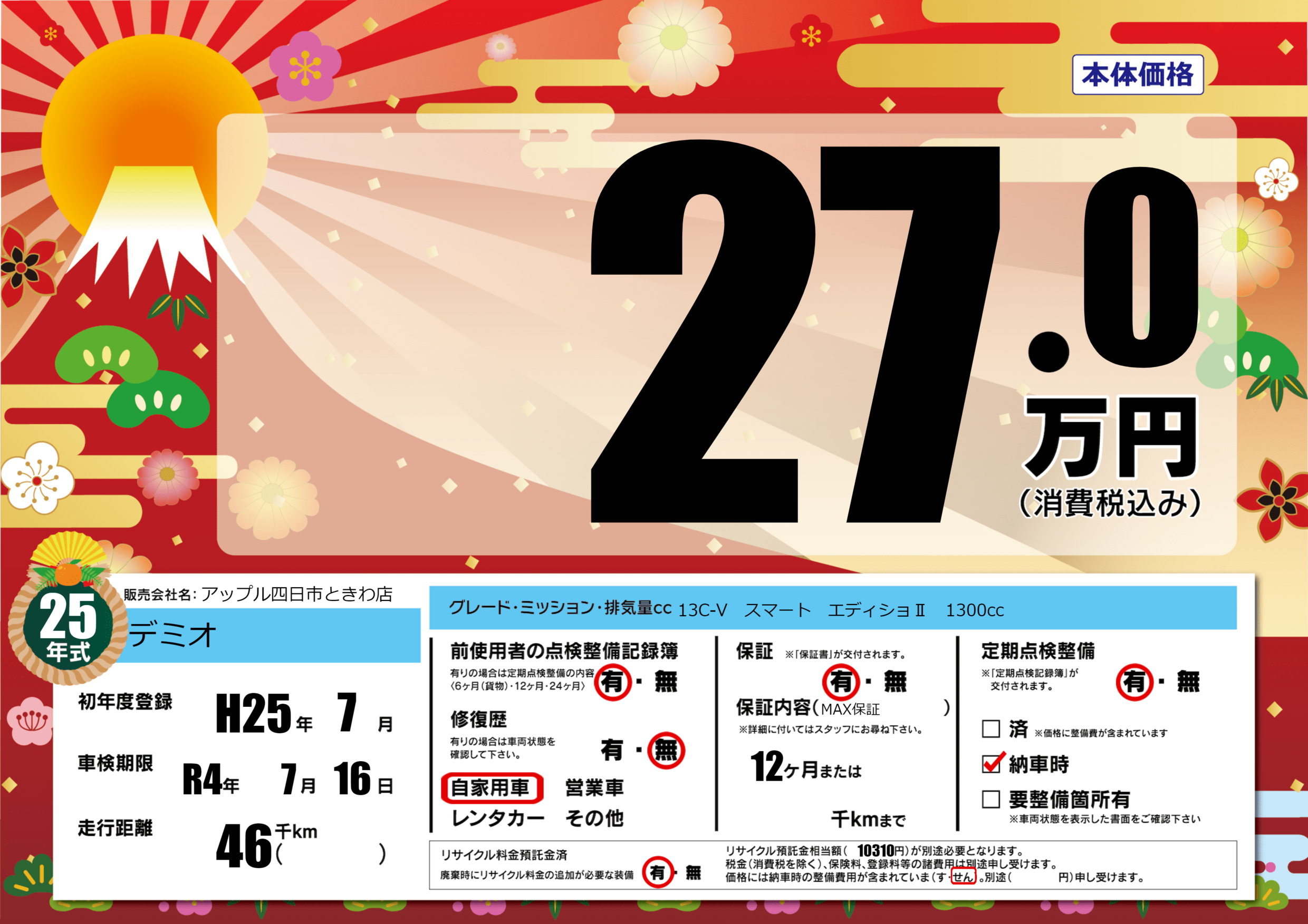 | 車名 | デミオ | グレード ミッション 排気量 |