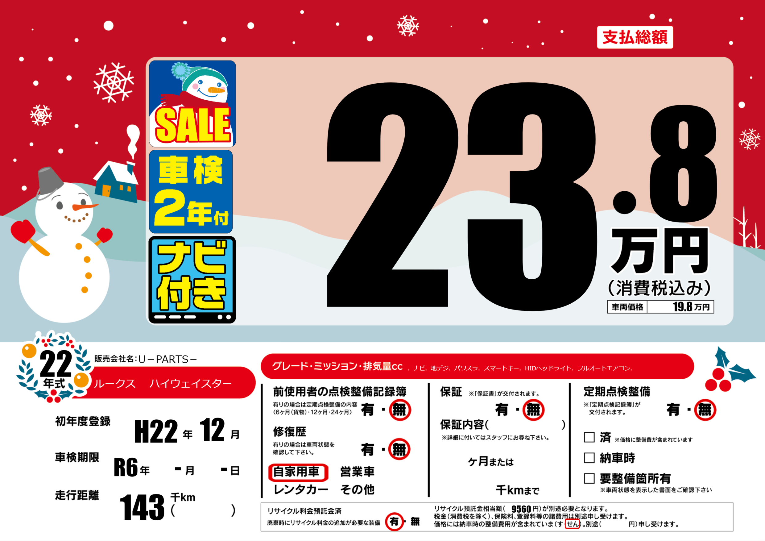 | 走行キロ | 14.3万km | 初年度登録 | H22年12月 |