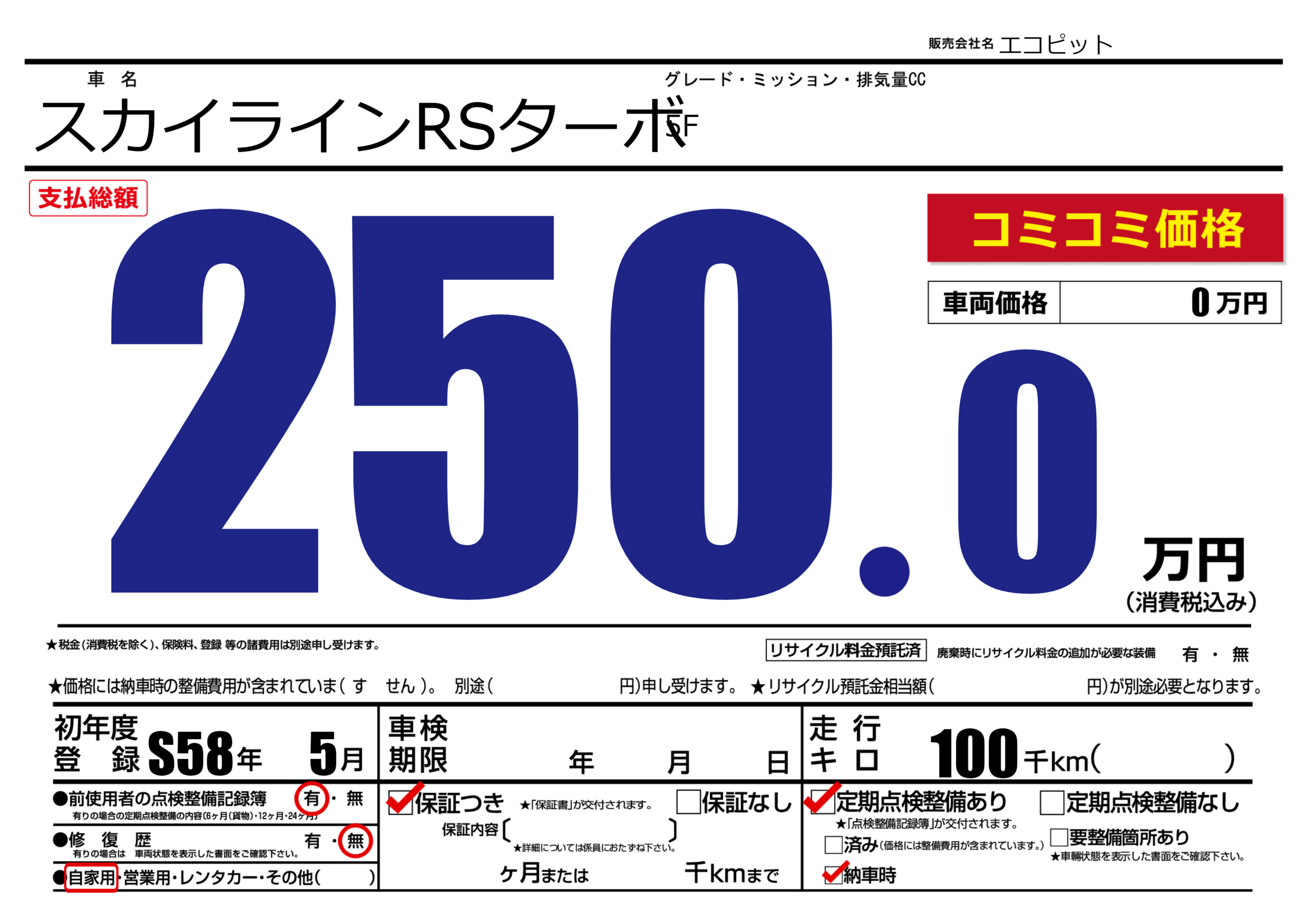 | 車名 | スカイラインRSターボ | グレード ミッション 排気量 |