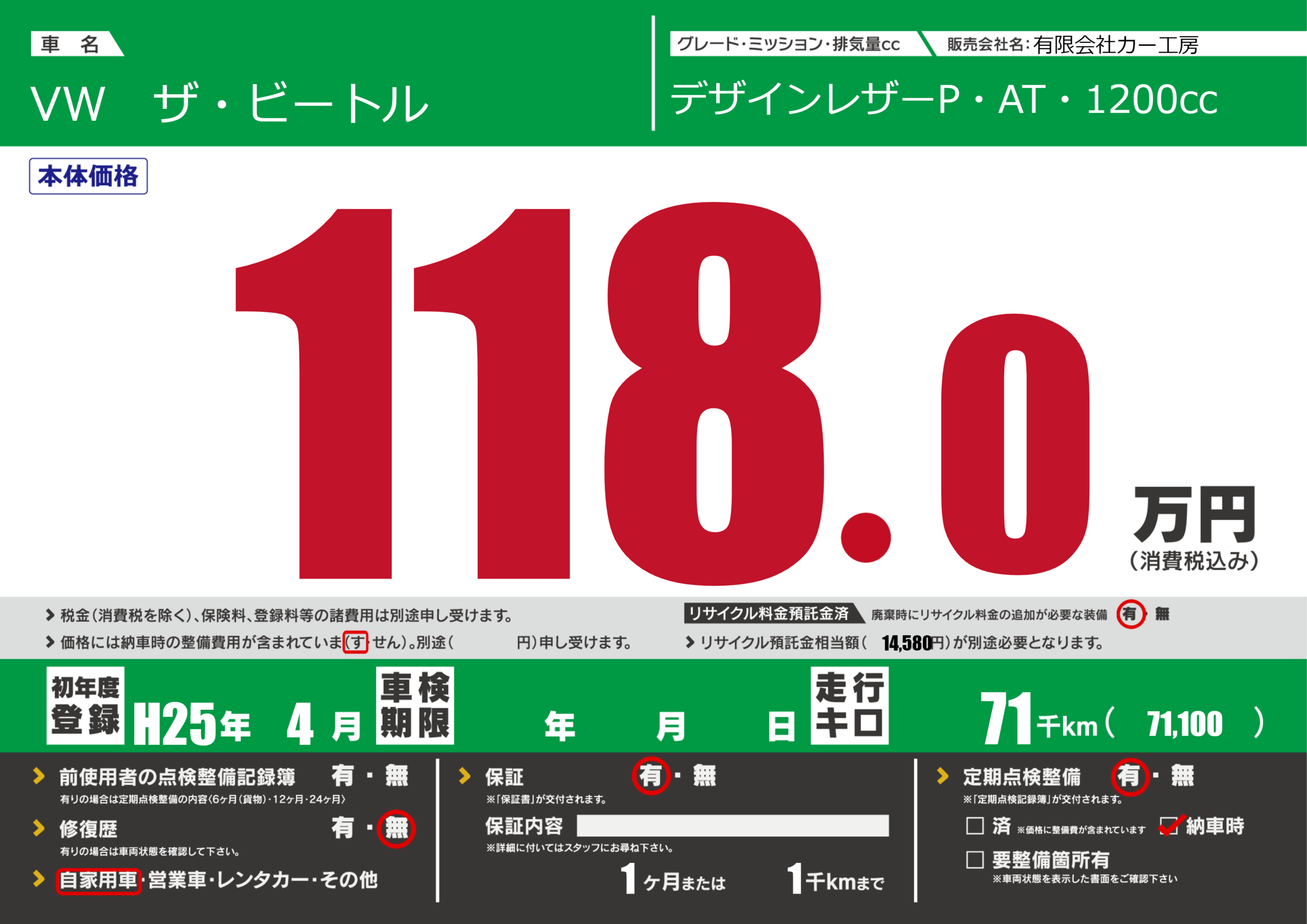 | 車名 | VW ザ・ビートル | グレード ミッション 排気量 |