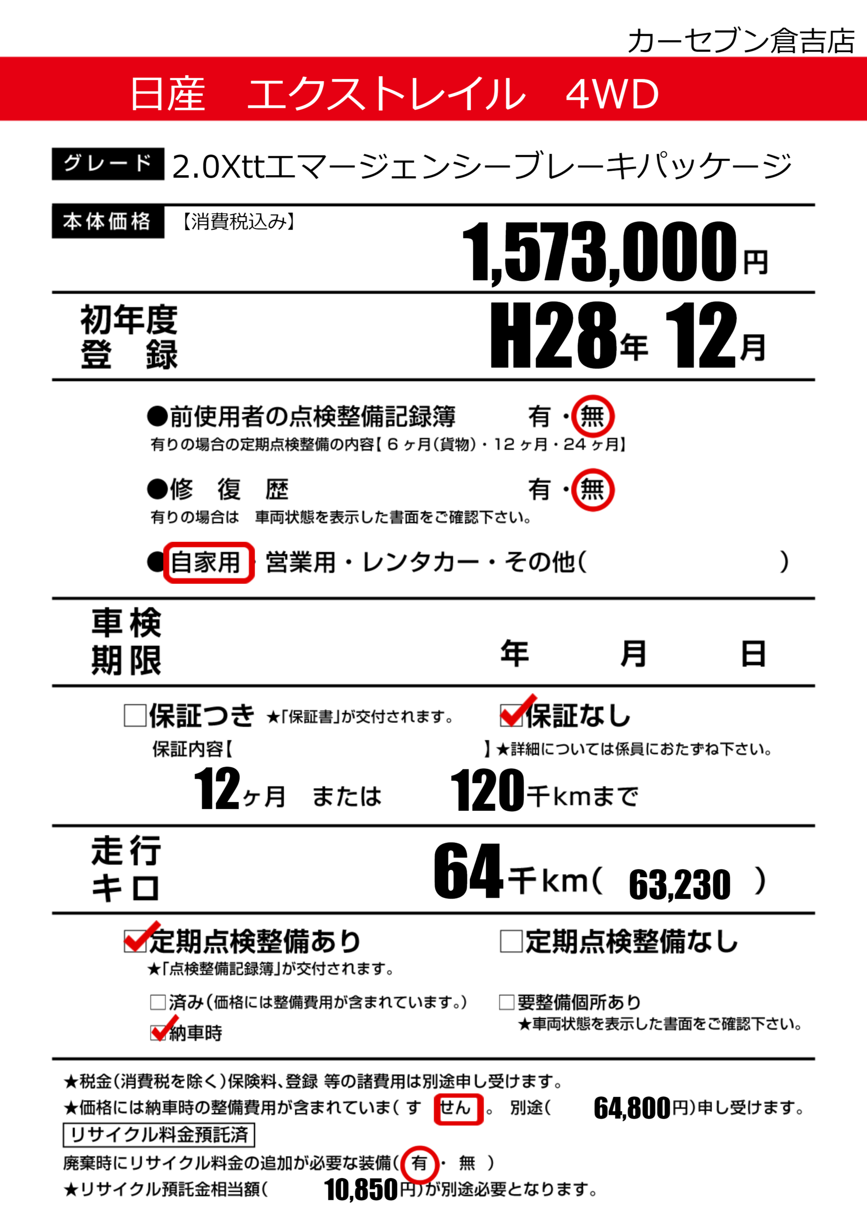 | 定期点検整備 | 定期点検整備あり 納車時あり | ||
