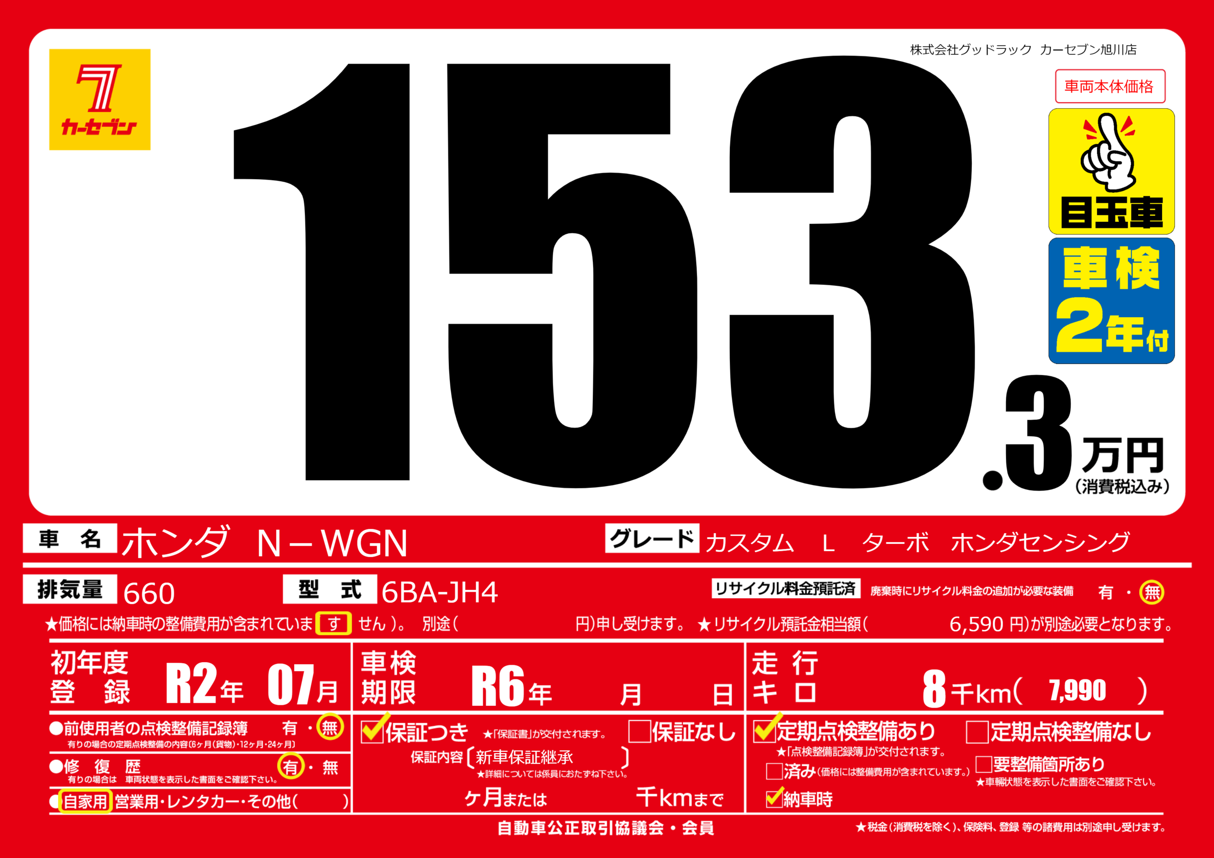 | 車名 | ホンダ N-WGN | グレード ミッション 排気量 |