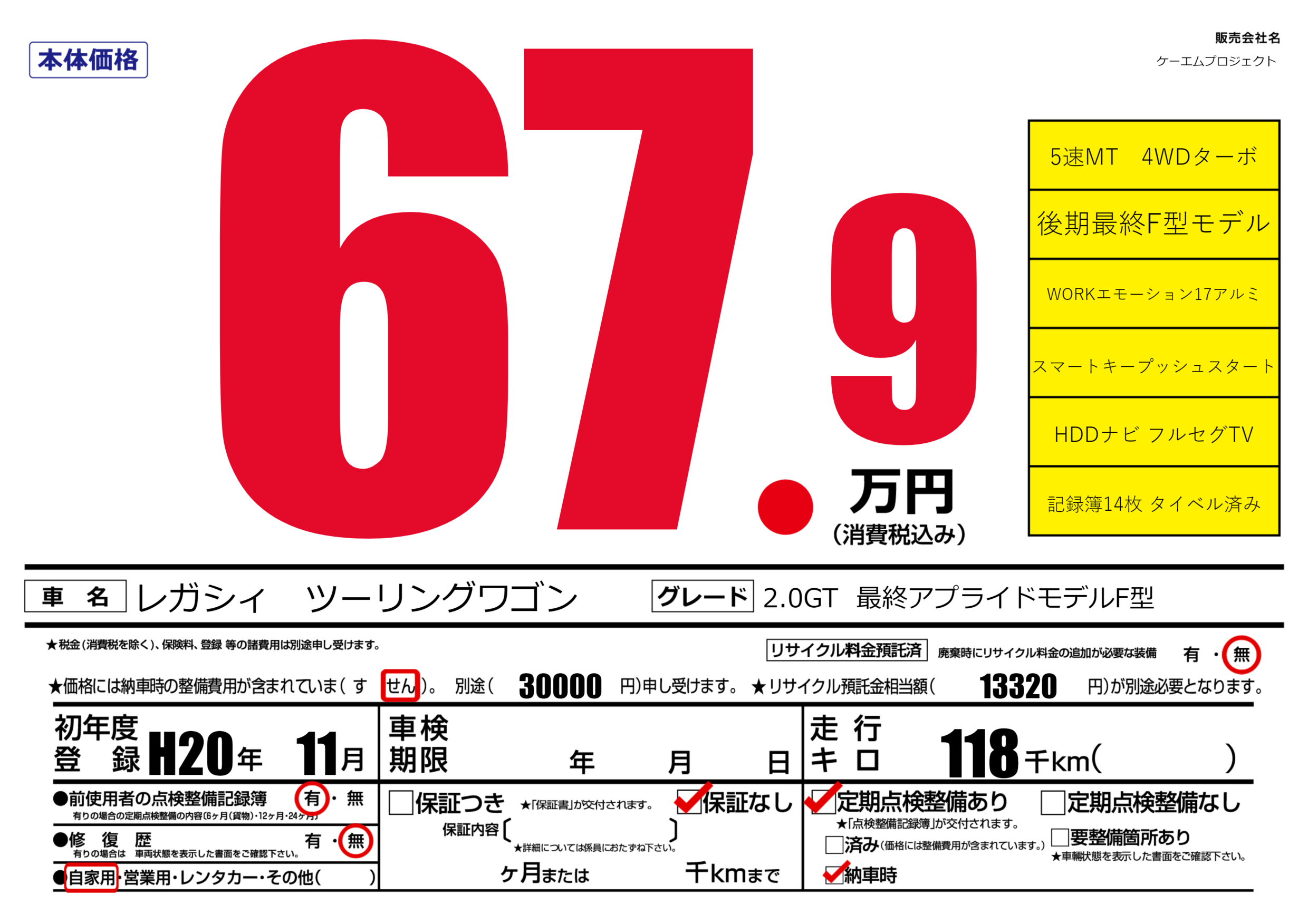 | 車名 | レガシィ ツーリングワゴン | グレード ミッション 排気量 |
