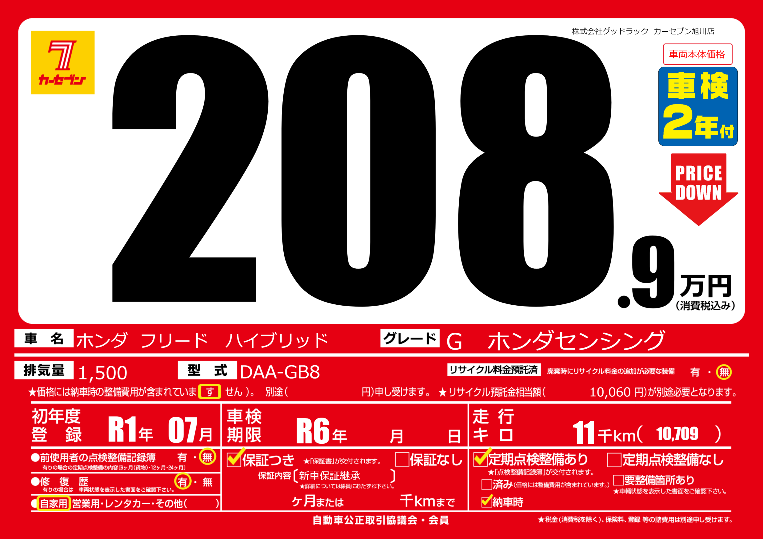 | 車名 | ホンダ フリード ハイブリッド | グレード ミッション 排気量 |