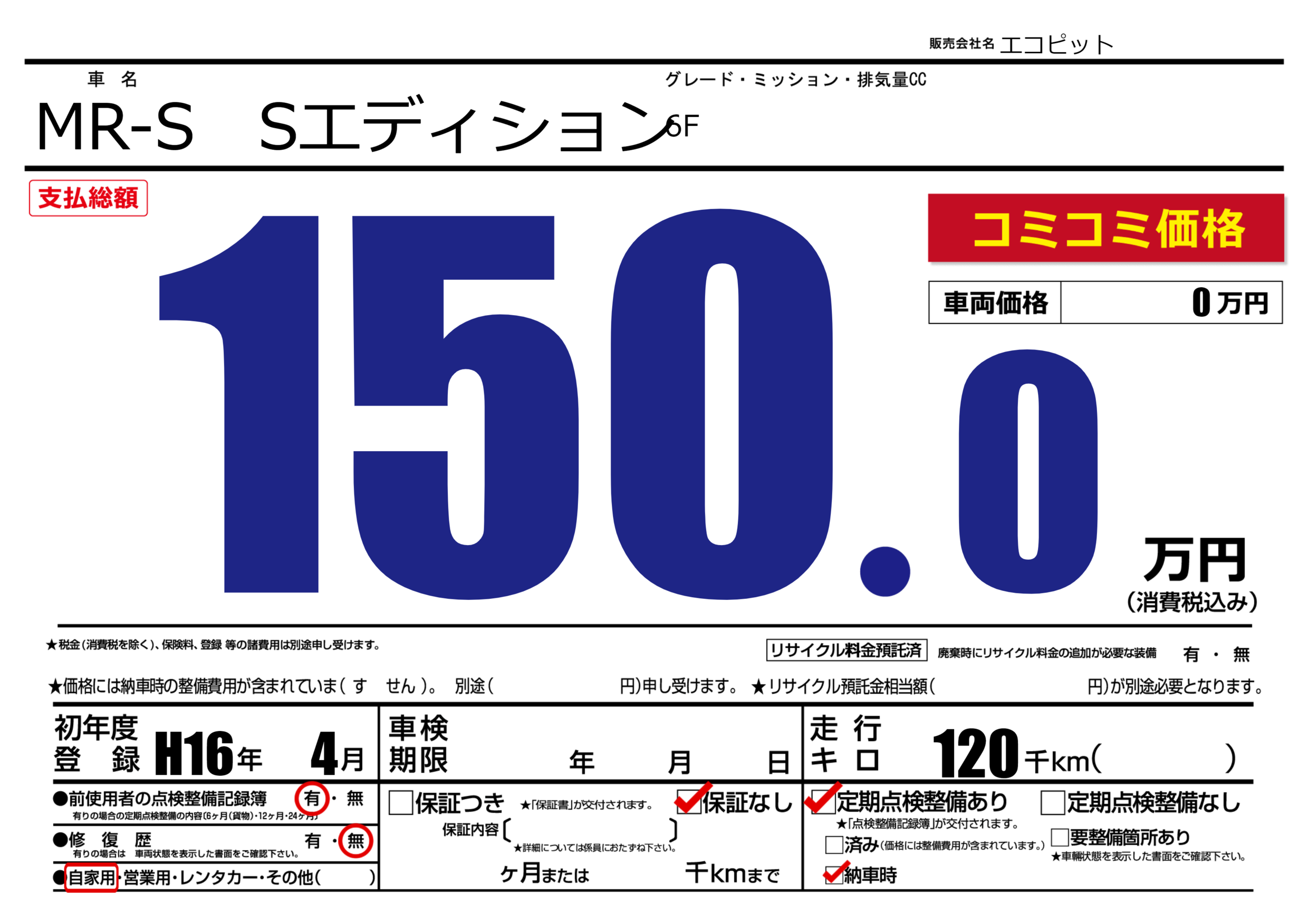 | 車名 | MR-S Sエディション | グレード ミッション 排気量 |