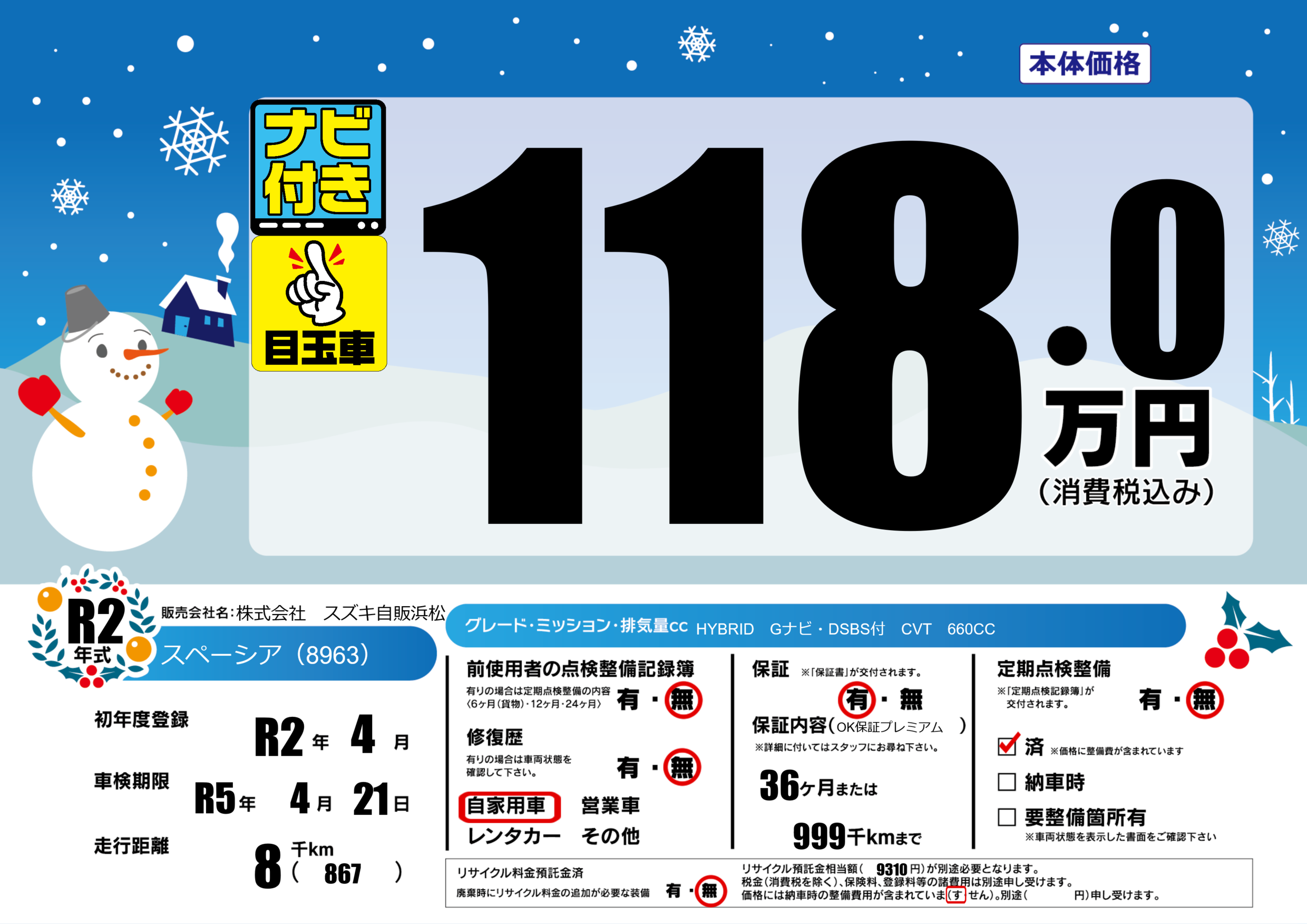 | 走行キロ | 0.8万km | 初年度登録 | R2年4月 |