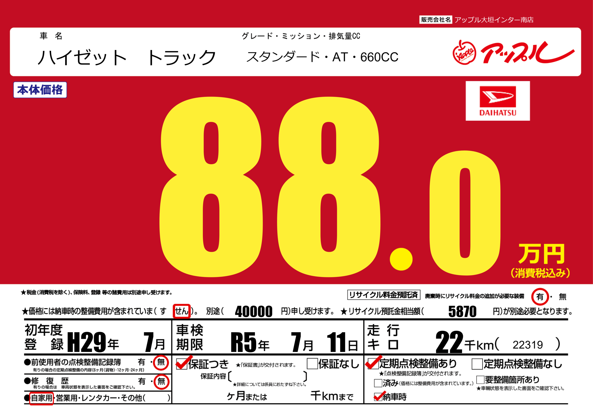 | 車名 | ハイゼット トラック | グレード ミッション 排気量 |