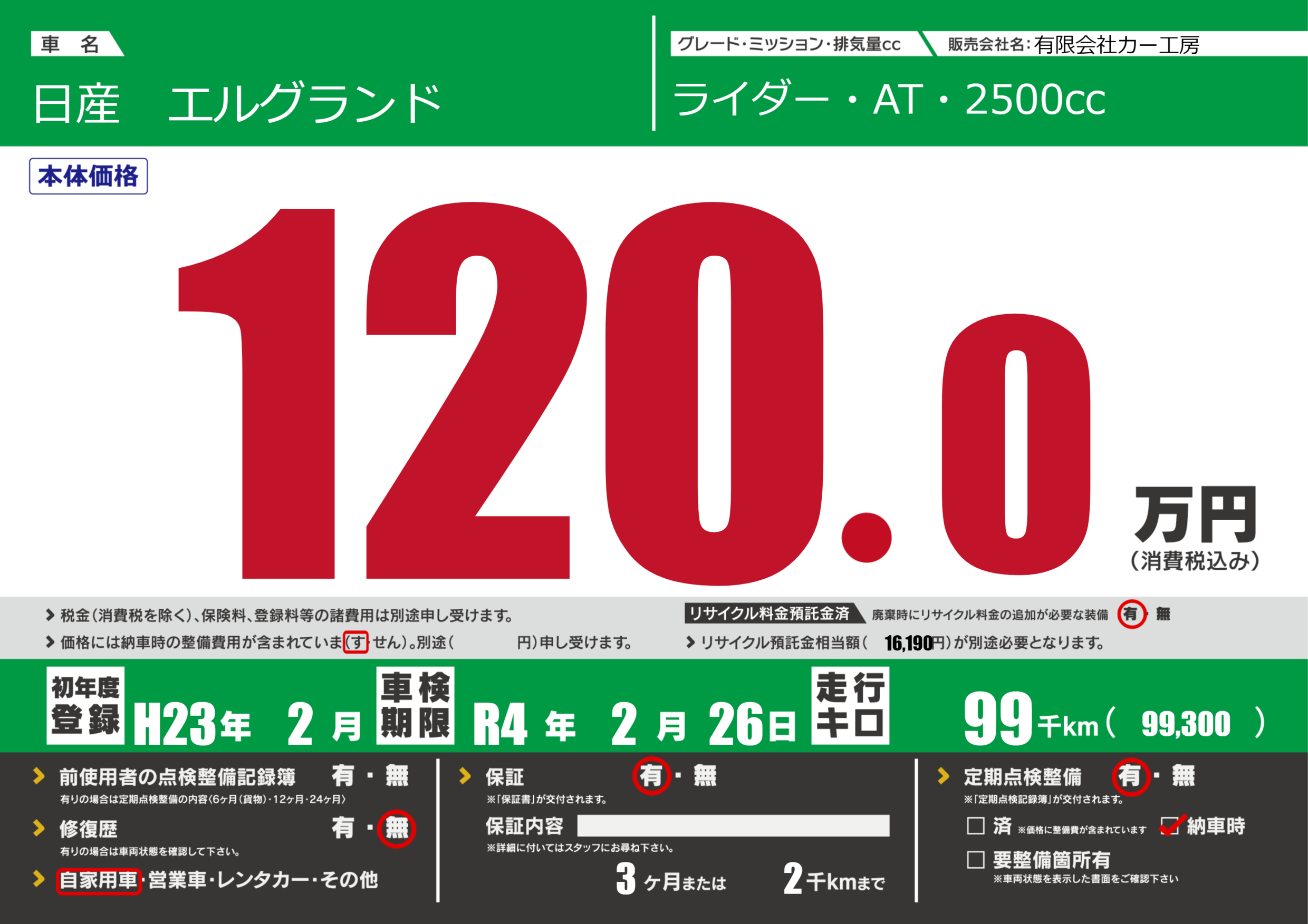 | 車名 | 日産 エルグランド | グレード ミッション 排気量 |