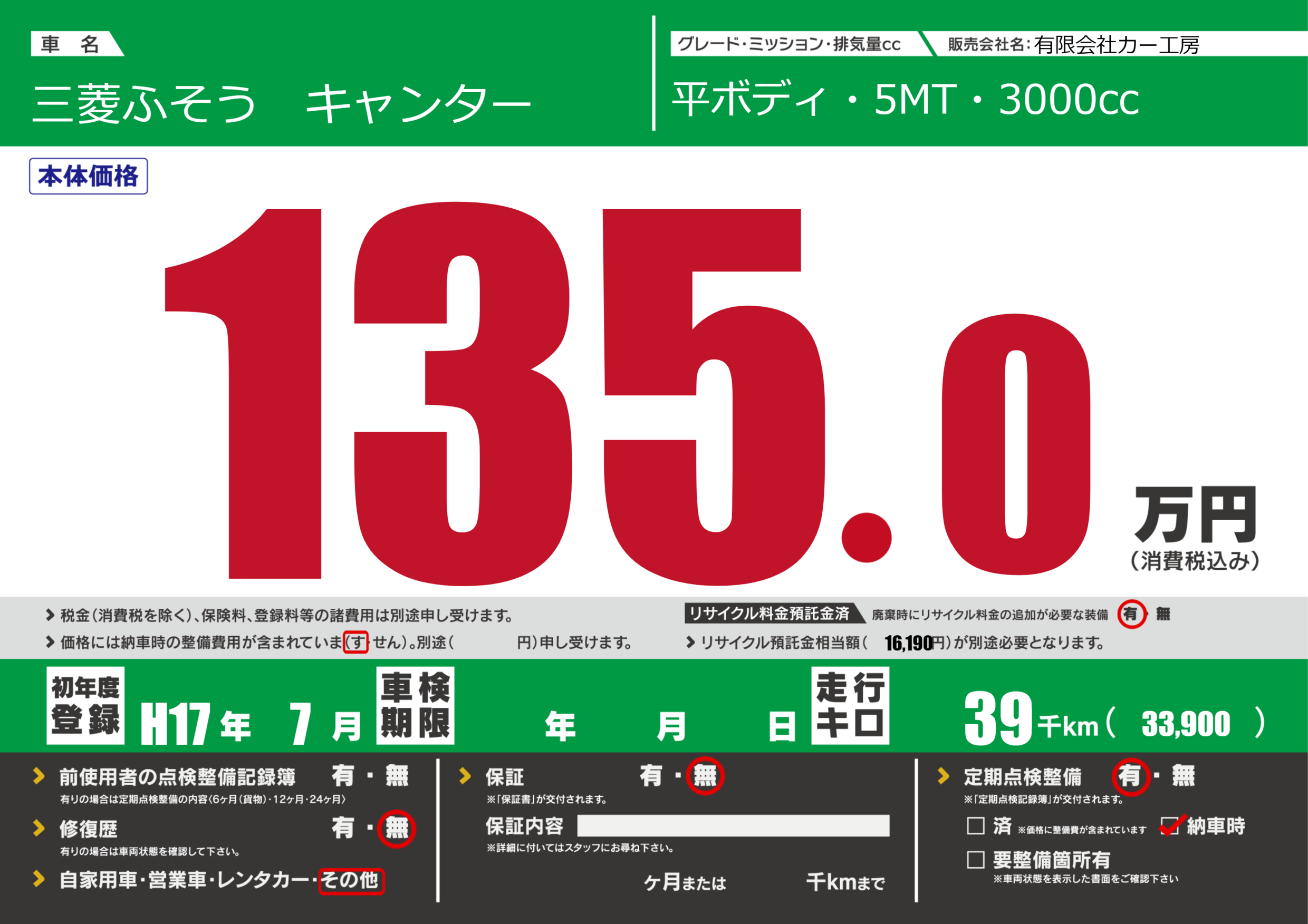 | 車名 | 三菱ふそう キャンター | グレード ミッション 排気量 |