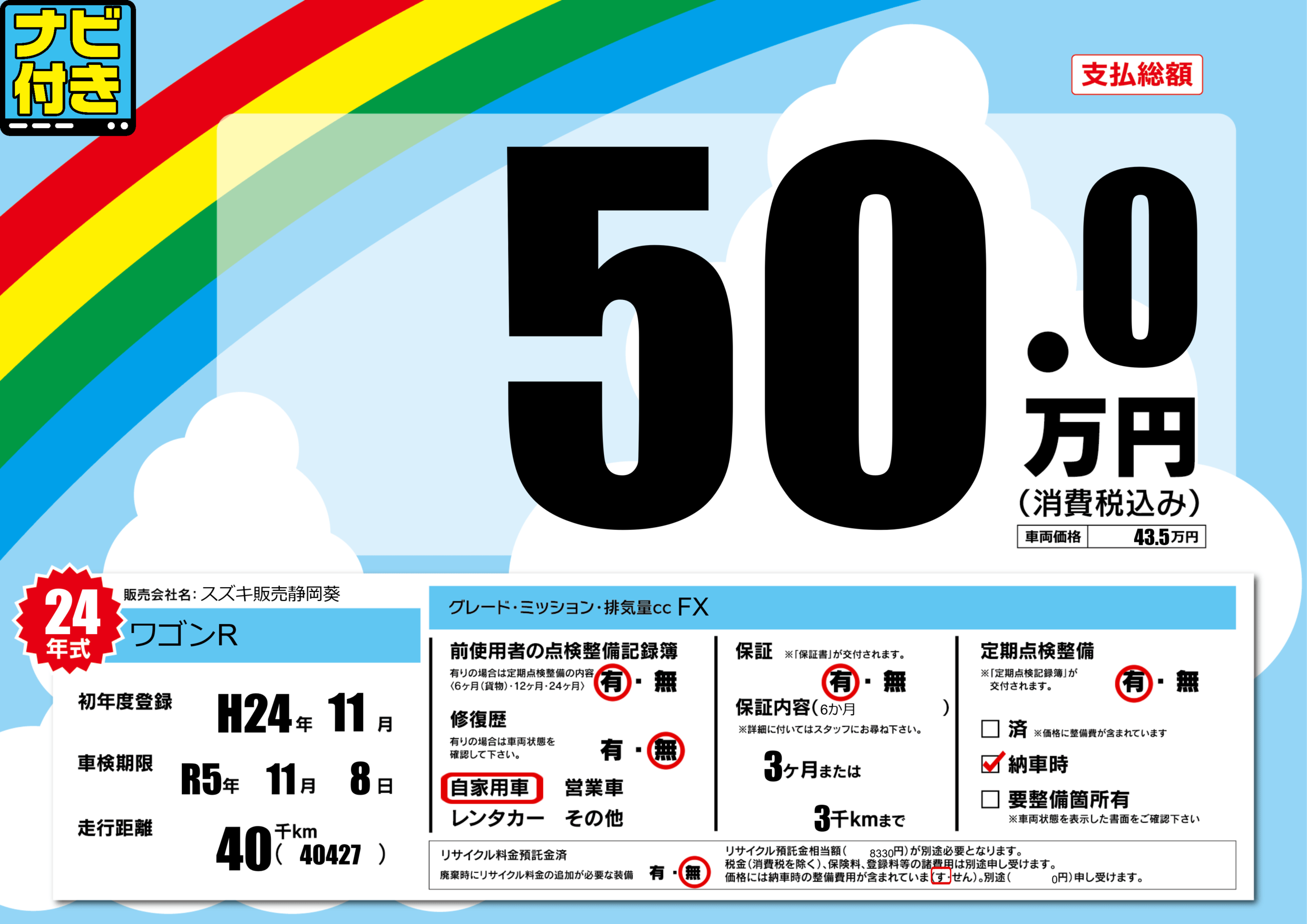 | 定期点検整備 | 定期点検整備あり 納車時あり | ||