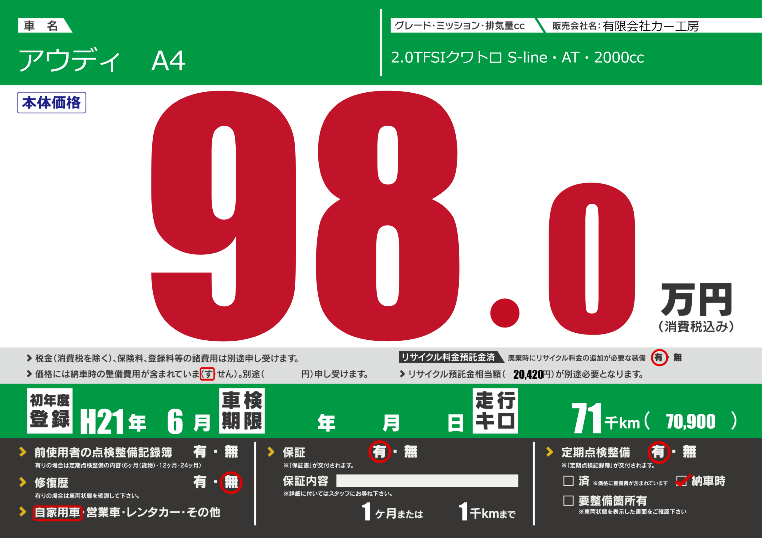 | 車名 | アウディ A4 | グレード ミッション 排気量 |