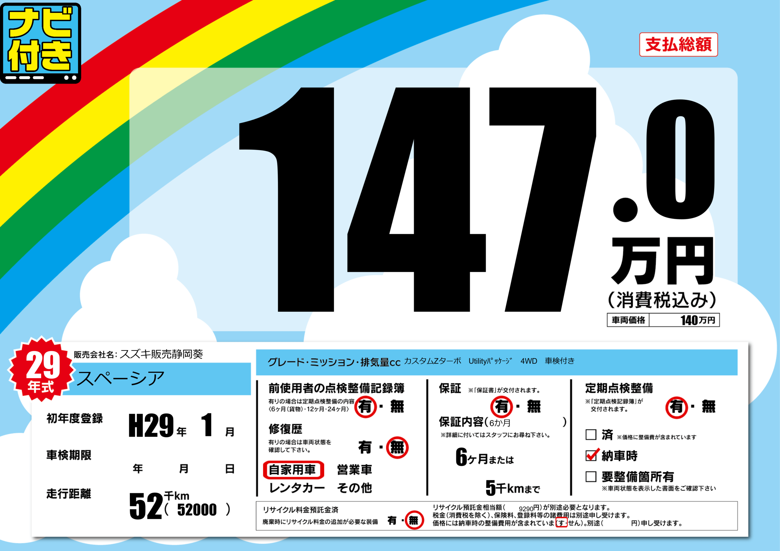 | 定期点検整備 | 定期点検整備あり 納車時あり | ||