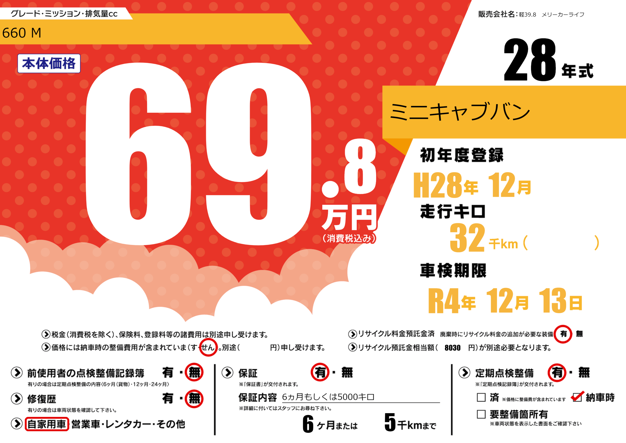 | 定期点検整備 | 定期点検整備あり 納車時あり | ||