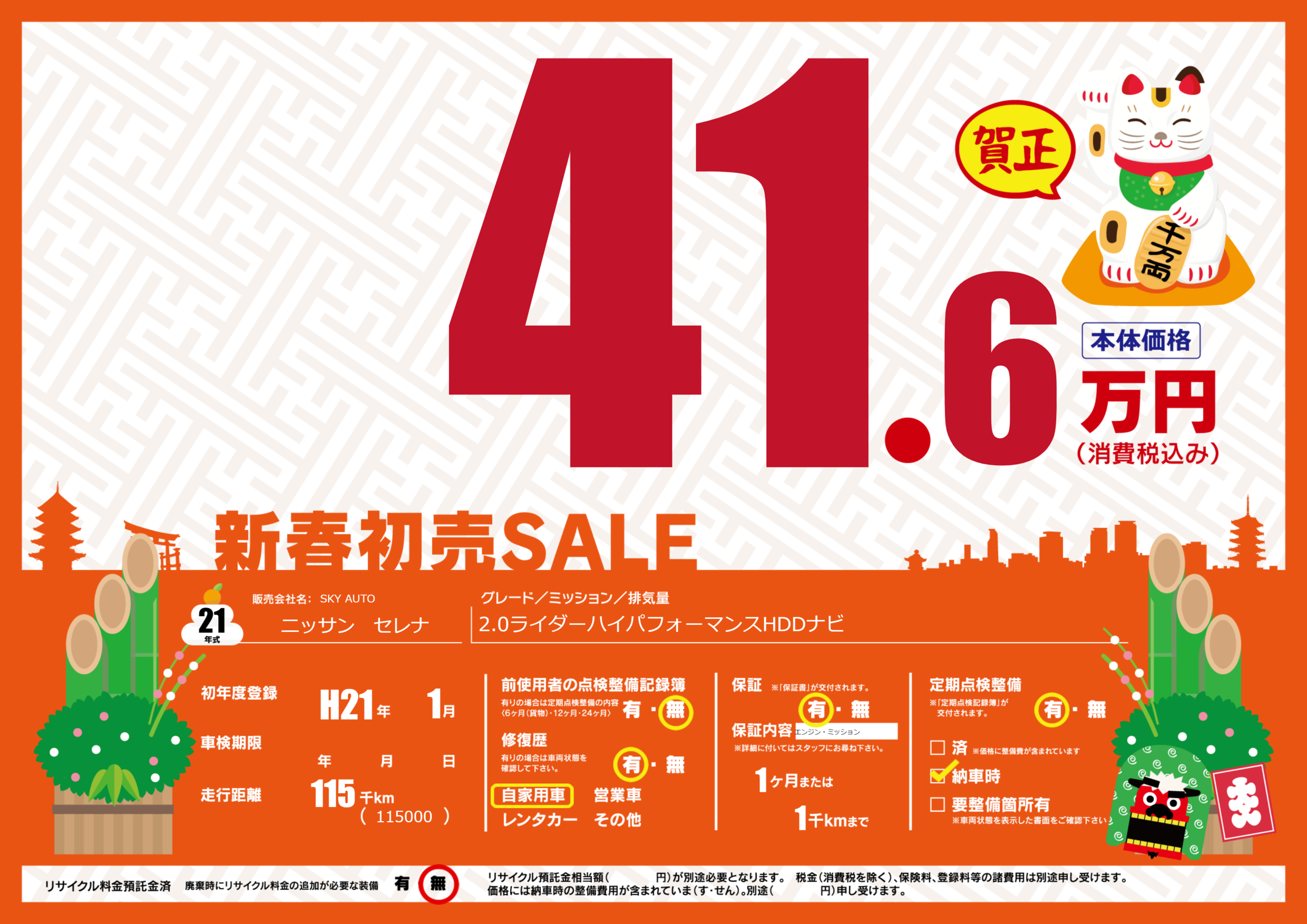 | 走行キロ | 11.5万km | 初年度登録 | H21年1月 |