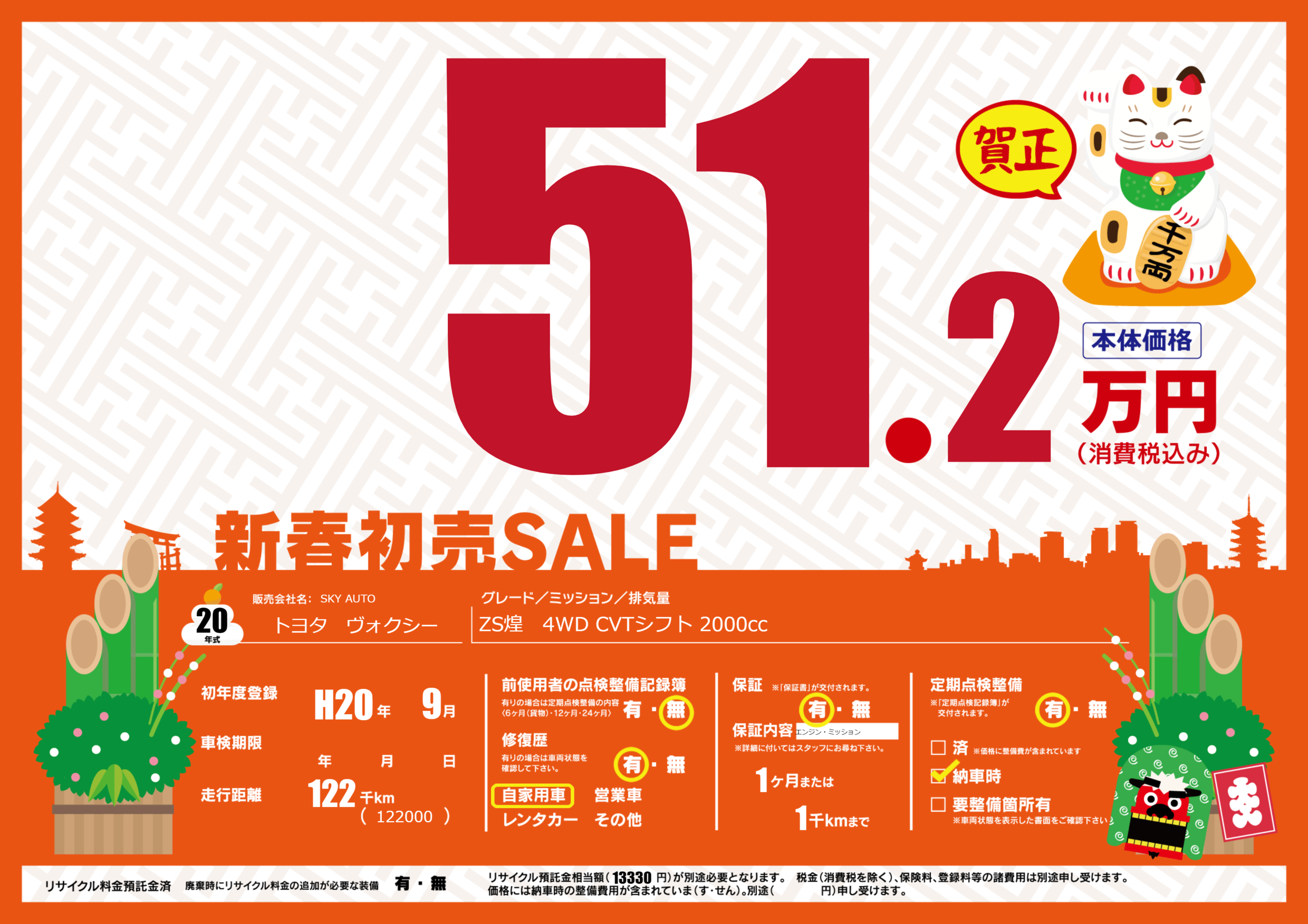 | 走行キロ | 12.2万km | 初年度登録 | H20年9月 |