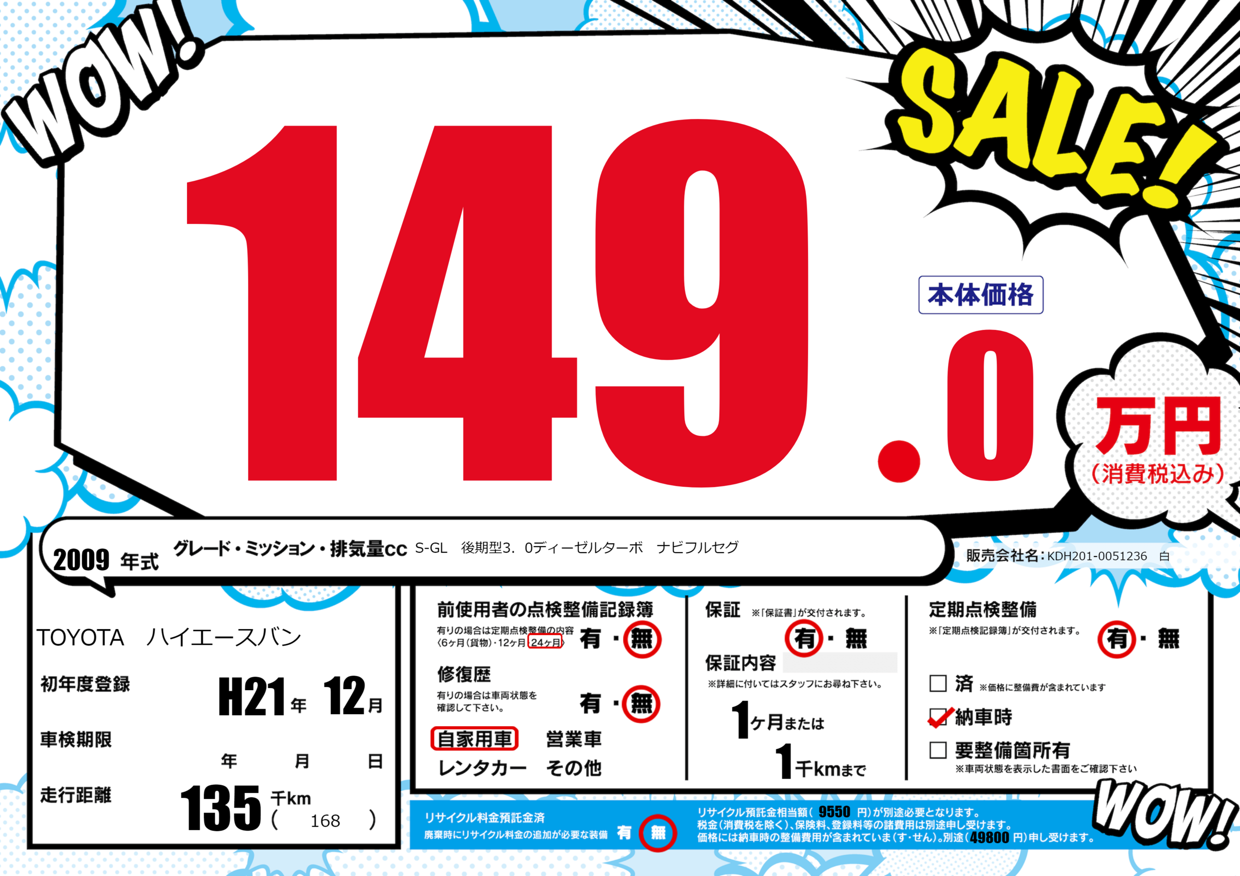 | 車名 | TOYOTA ハイエースバン | グレード ミッション 排気量 |