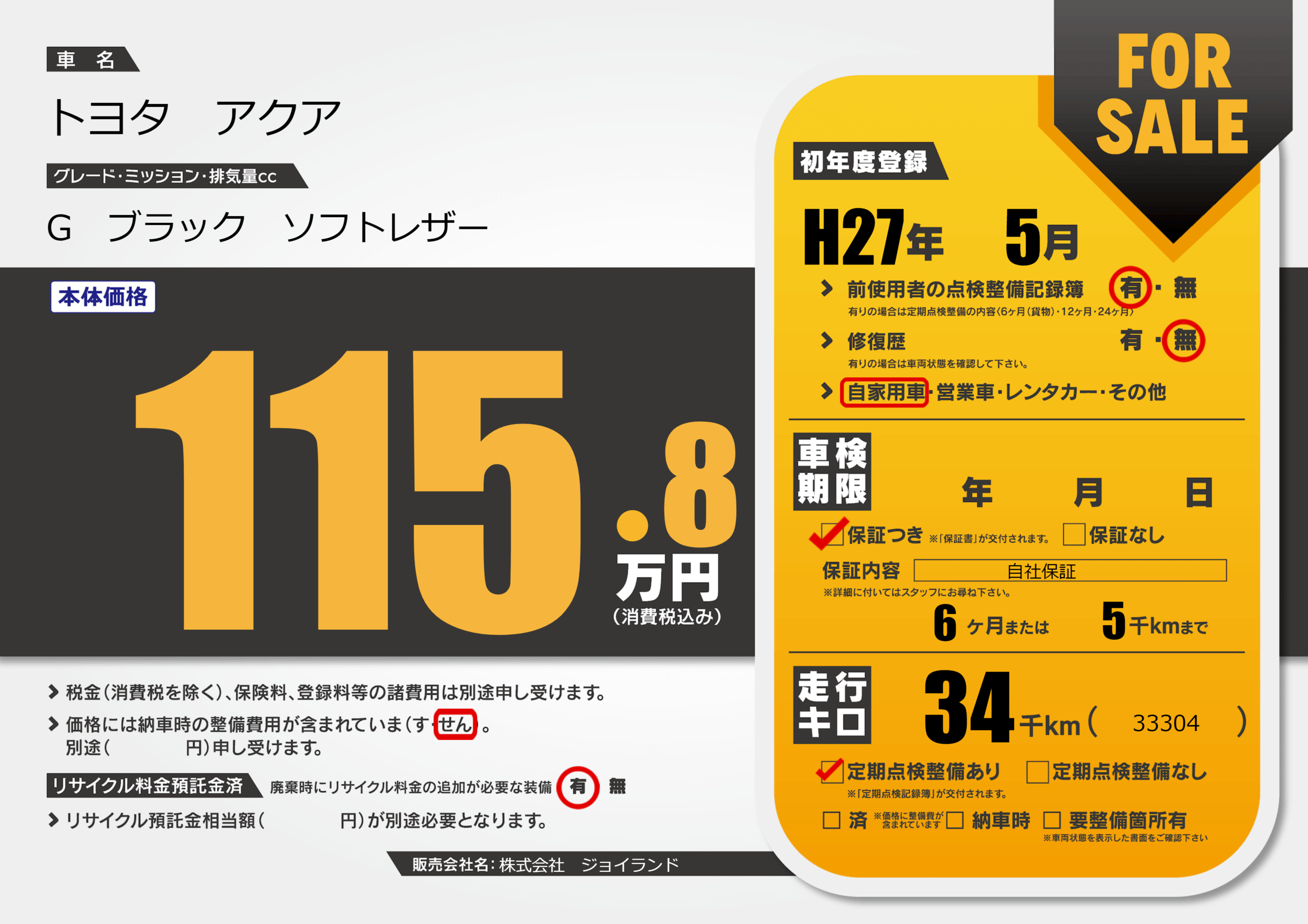 | 車名 | トヨタ アクア | グレード ミッション 排気量 |