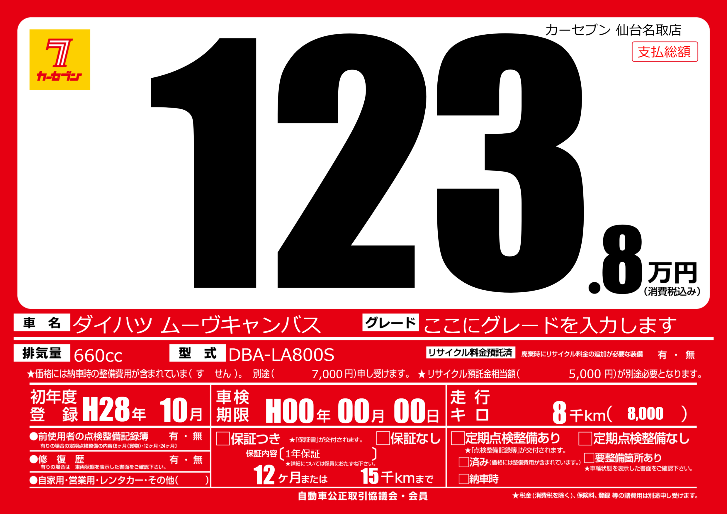 | 車名 | ダイハツ ムーヴキャンバス | グレード ミッション 排気量 |