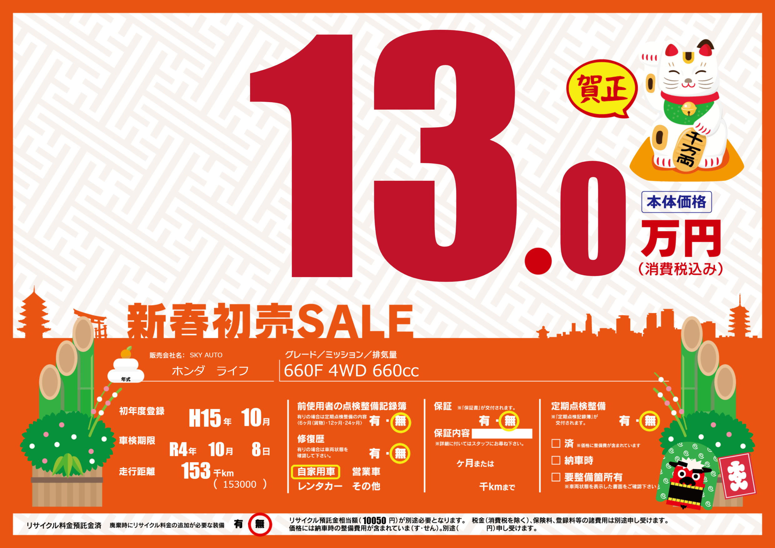 | 走行キロ | 15.3万km | 初年度登録 | H15年10月 |