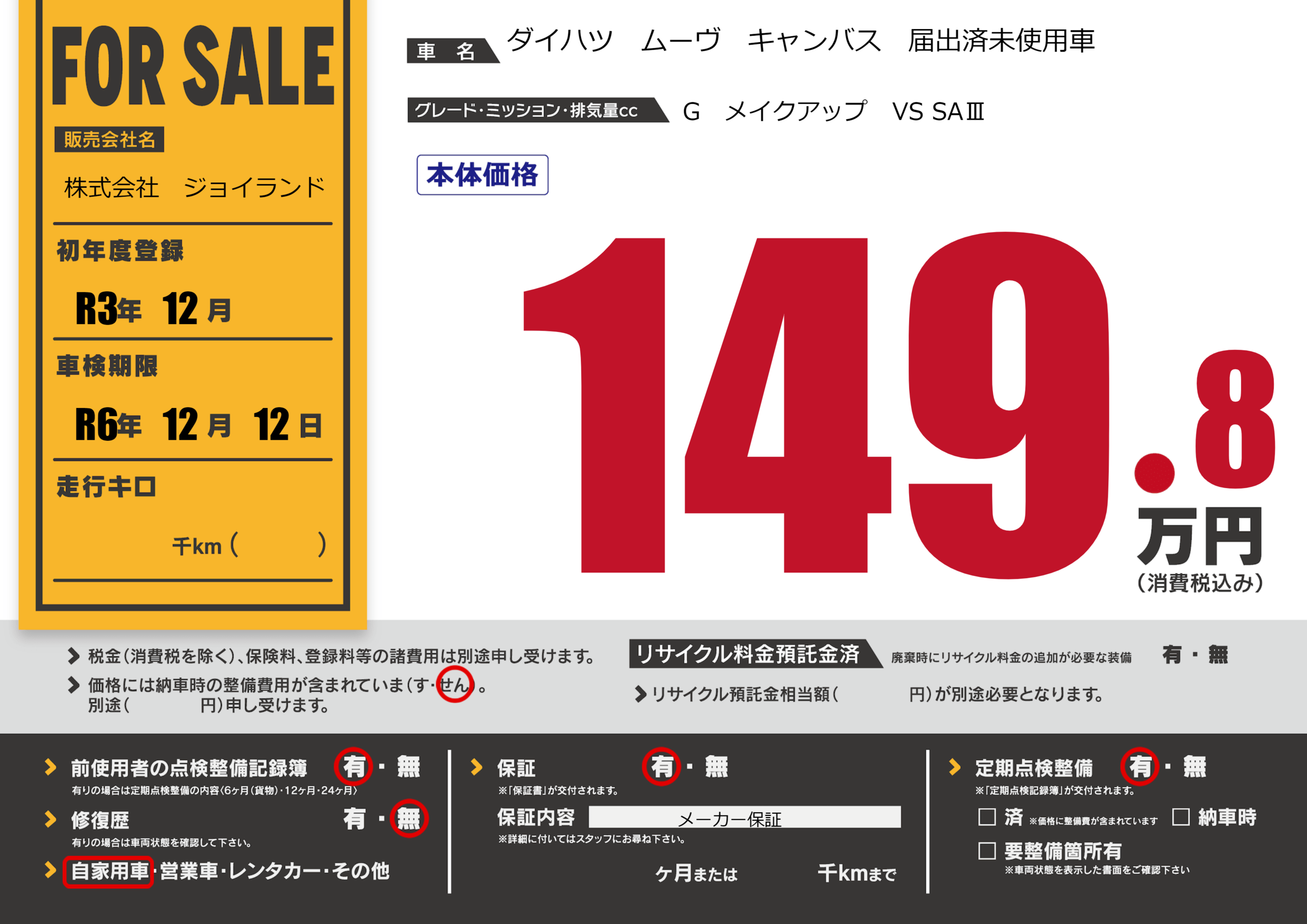 保証付き 保証内容( メーカー保証) ---ヶ月または()千kmまで |