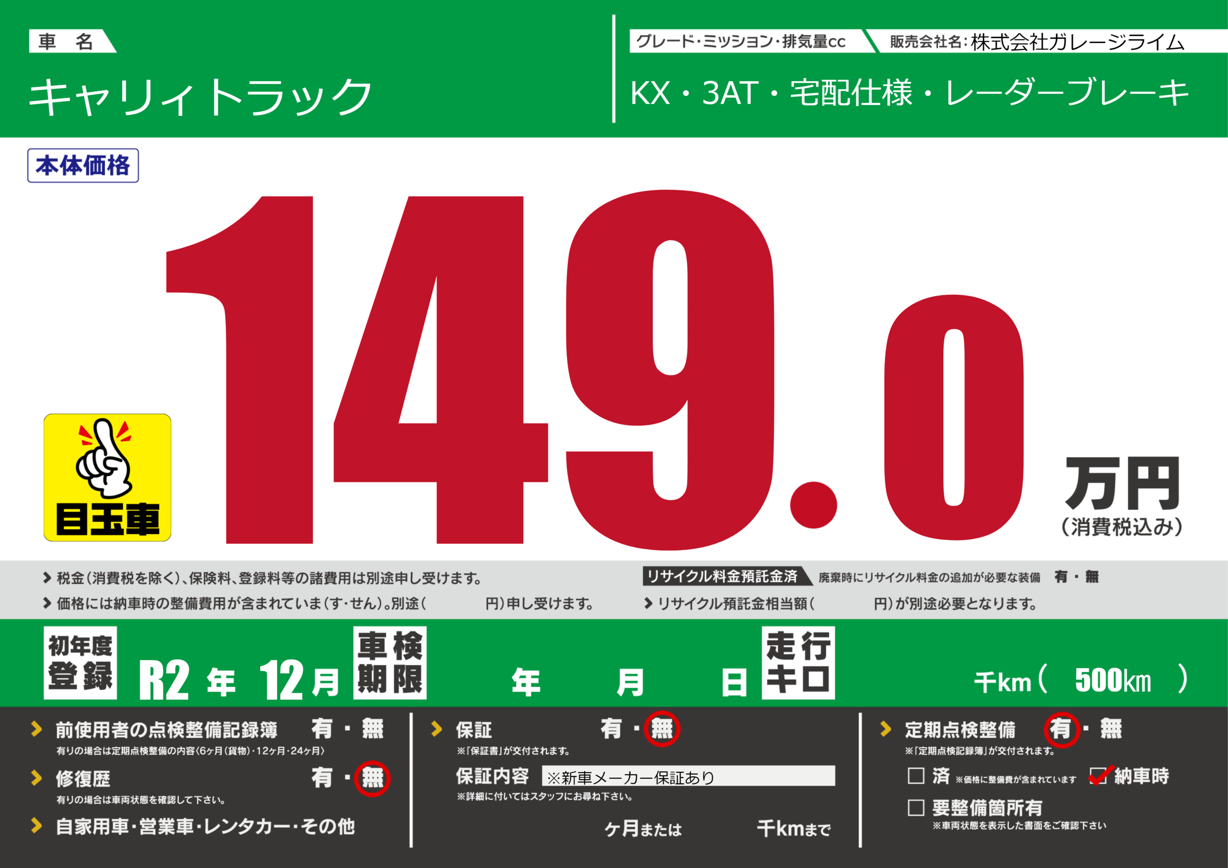 保証なし 保証内容(※新車メーカー保証あり) ヶ月または千km |
